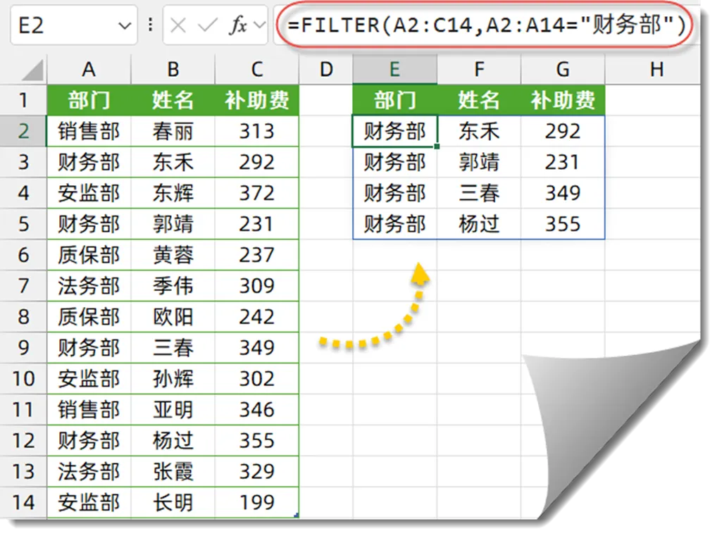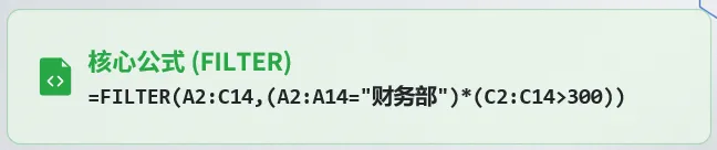 =FILTER(A2:C14,A2:A14=”财务部”)