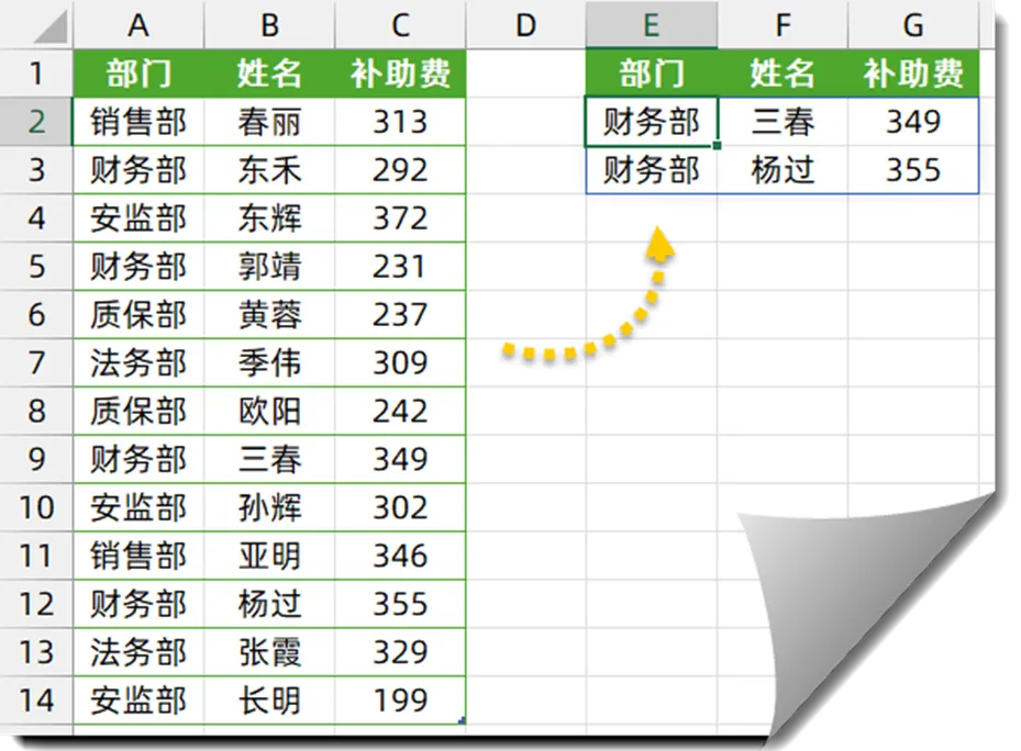 如下图所示,希望从左侧的数据源中,提取出部门为“财务部”,且补助费大于300的所有记录。