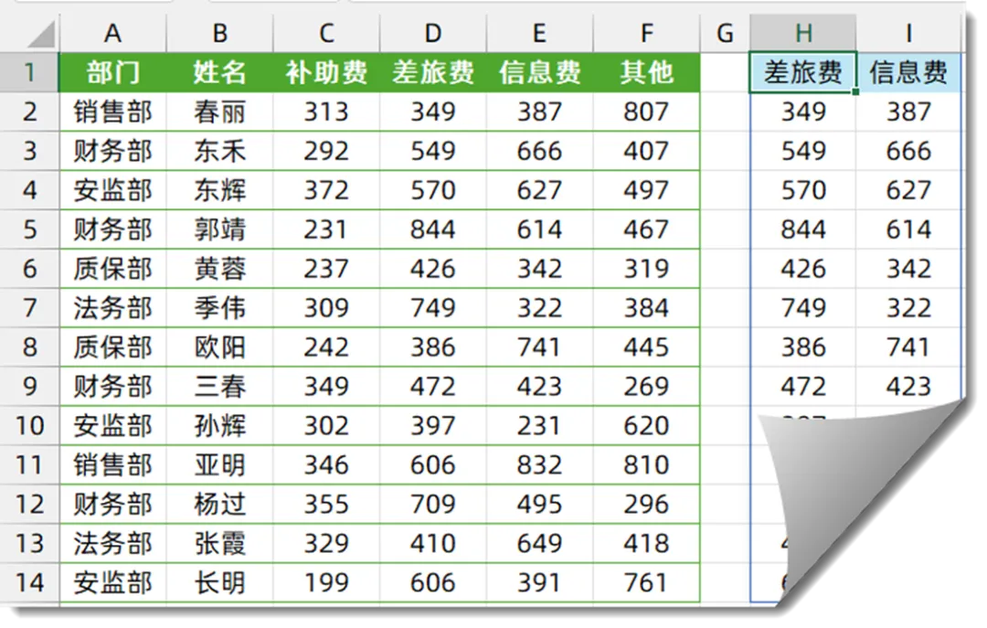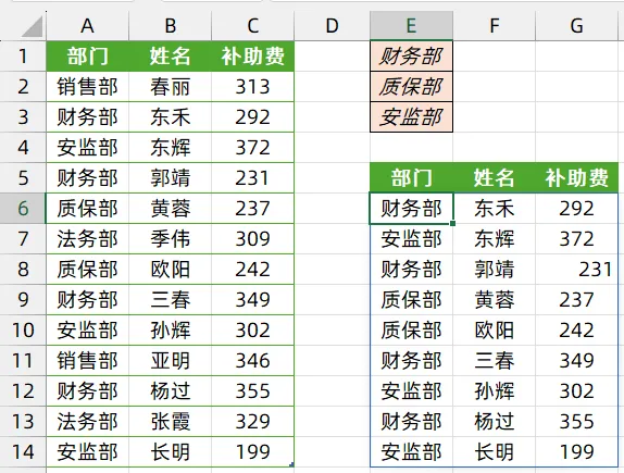 如下图所示,希望从左侧的数据源中,提取出部门为“财务部”以及“质保部”和“安监部”的所有记录。
