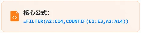 公式中的COUNTIF(E1:E3,A2:A14)部分,是FILTER函数的第二参数,也就是筛选的条件。