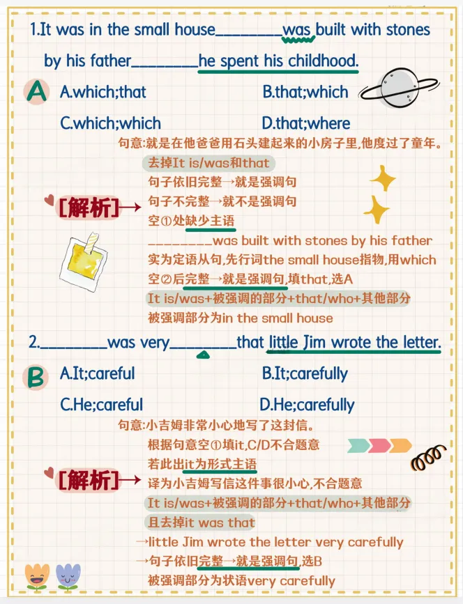解析指出,空①处为定语从句,修饰先行词“the small house”,用“which”;空②处为强调句结构,填“that”。