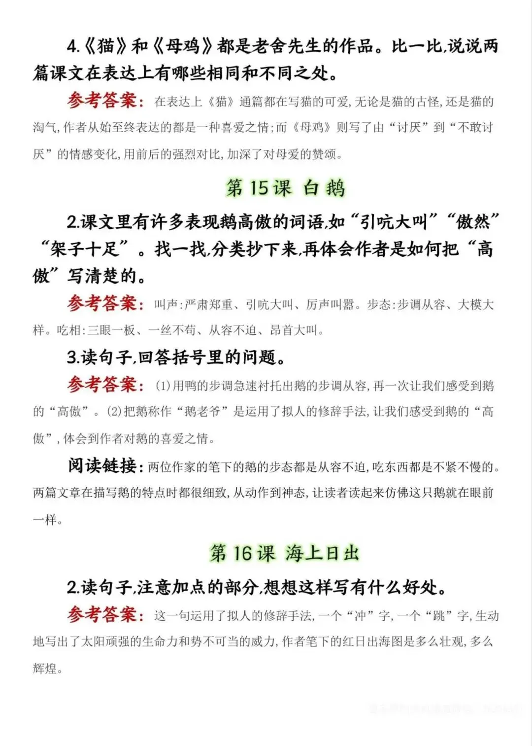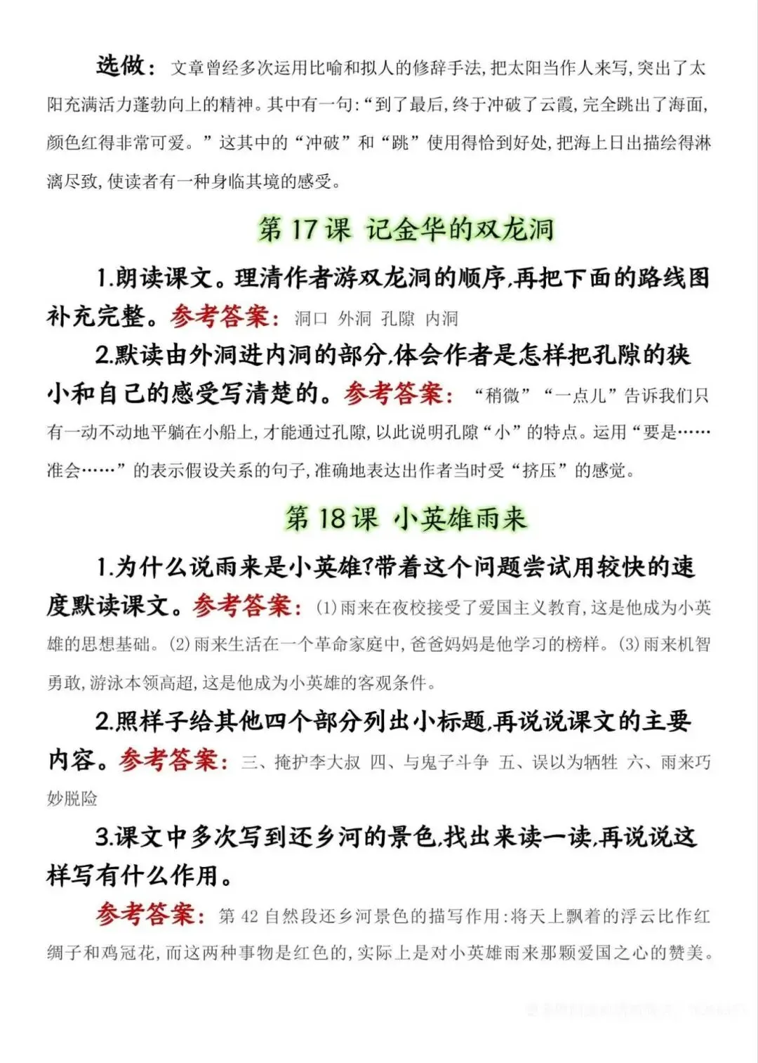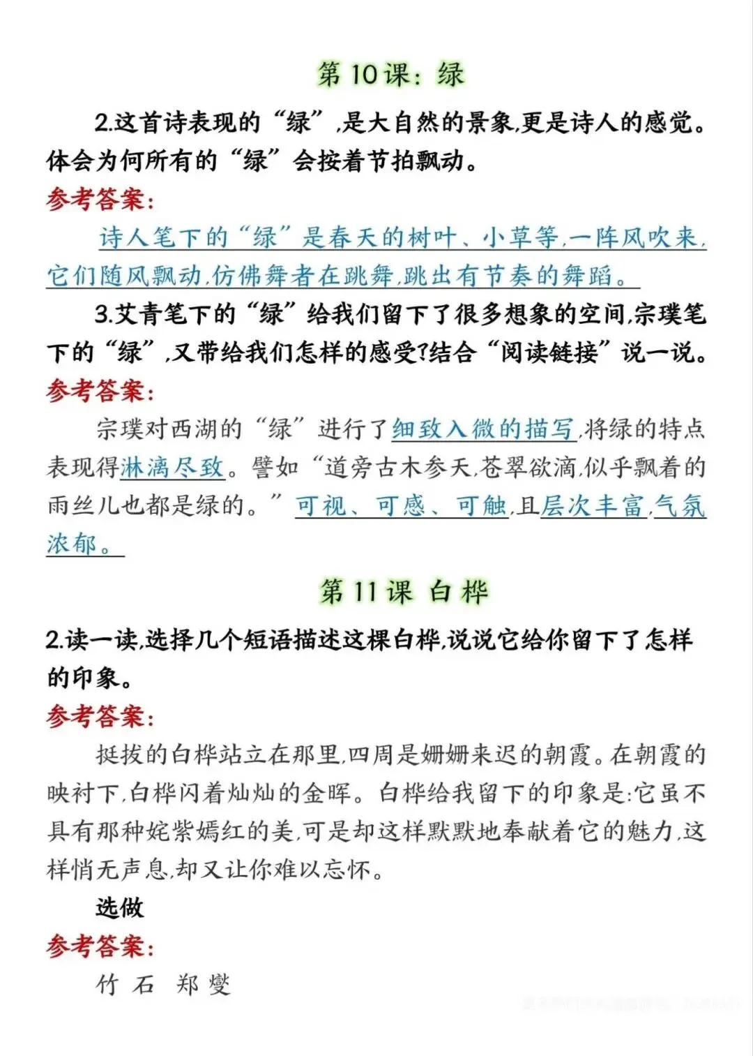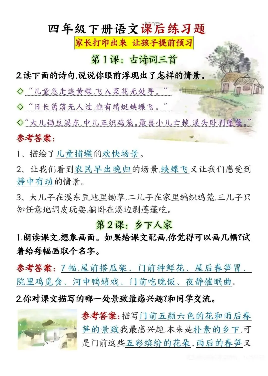 四年级下册语文课后练习题参考答案,电子版可下载打印