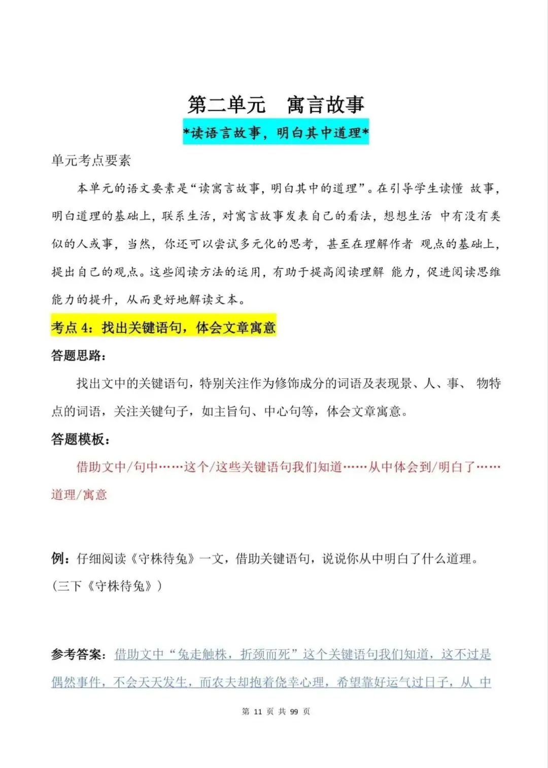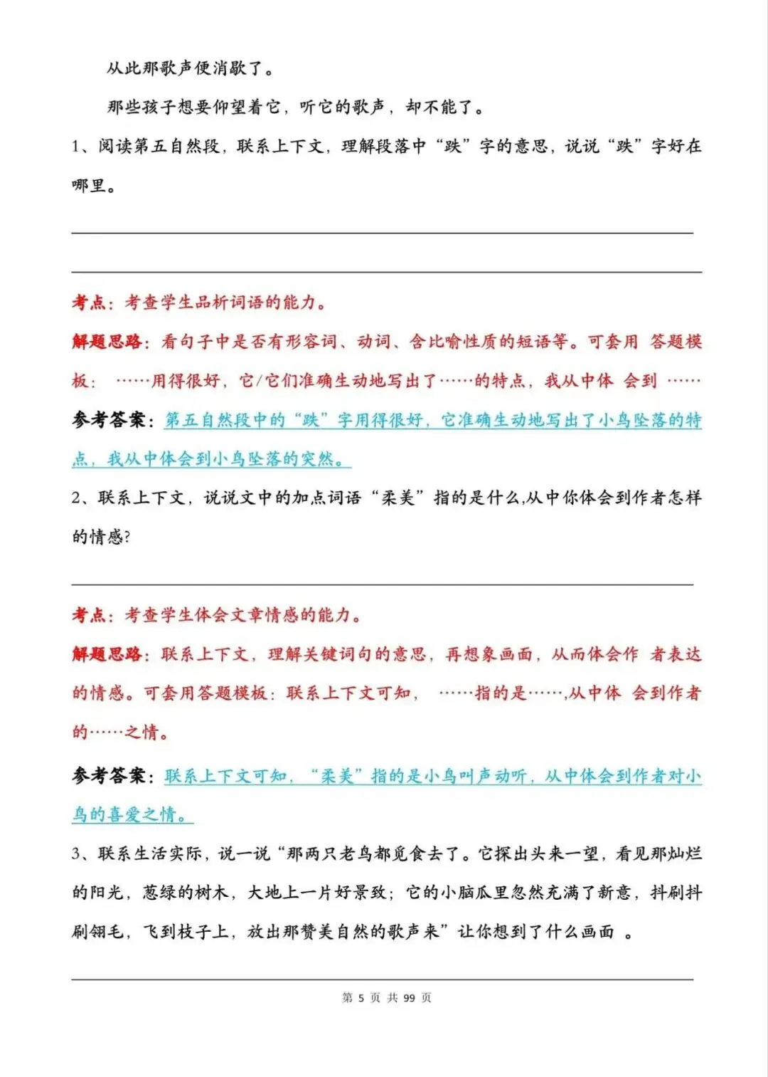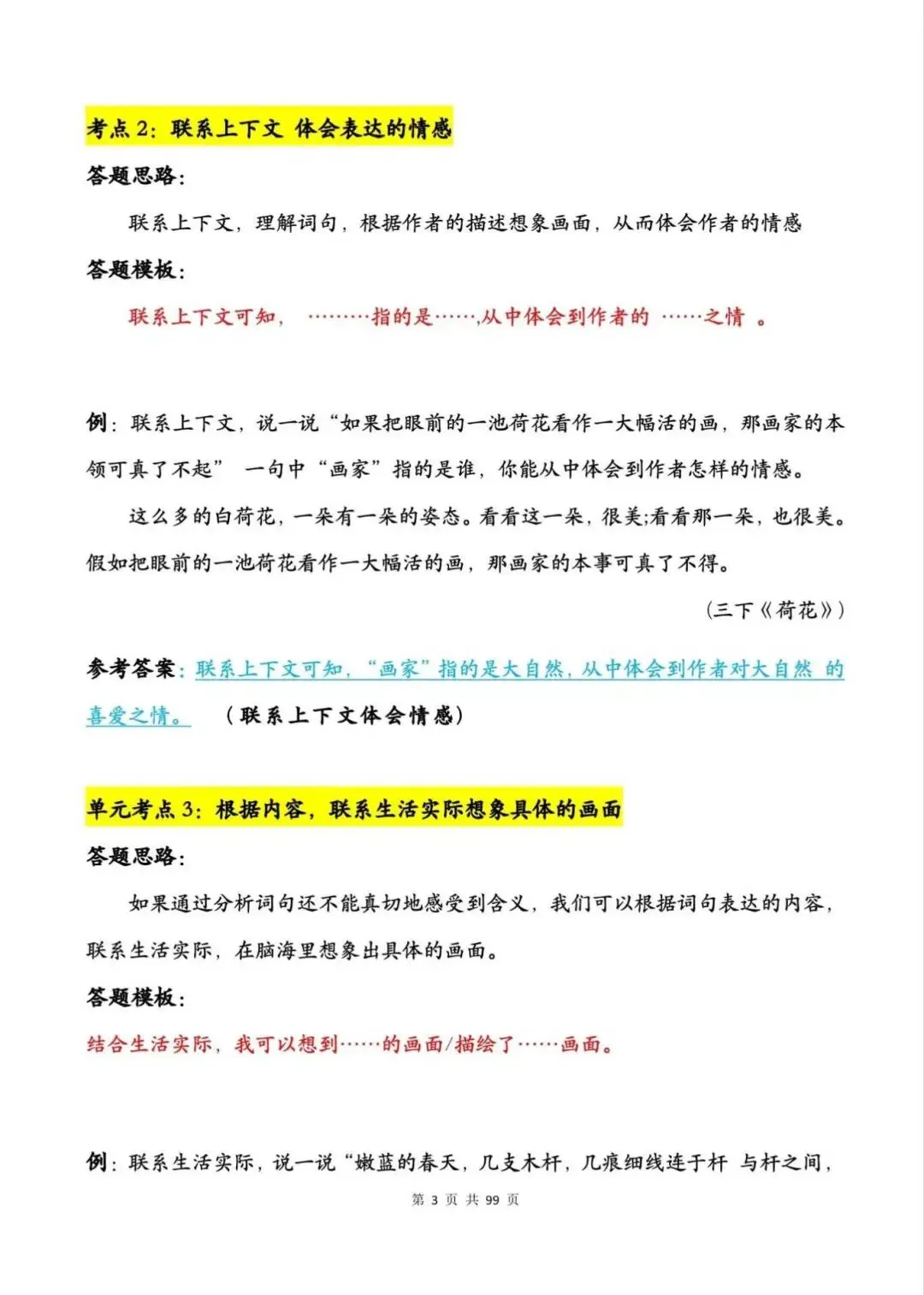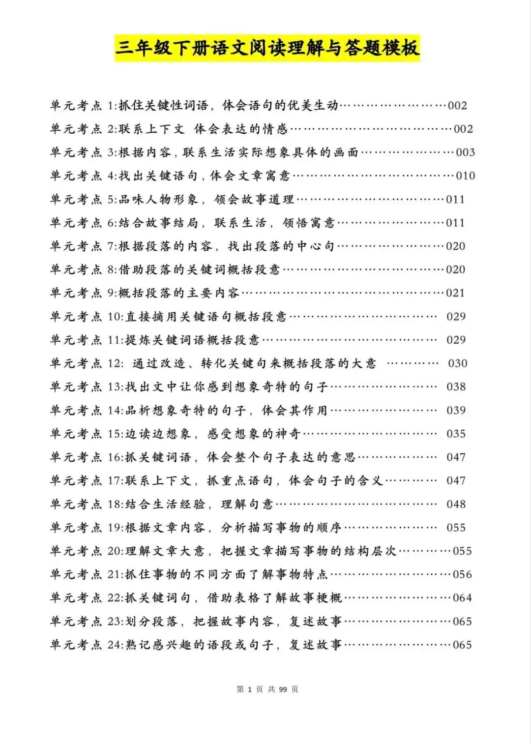 三年级下册语文阅读理解与答题模板,电子版可下载打印
