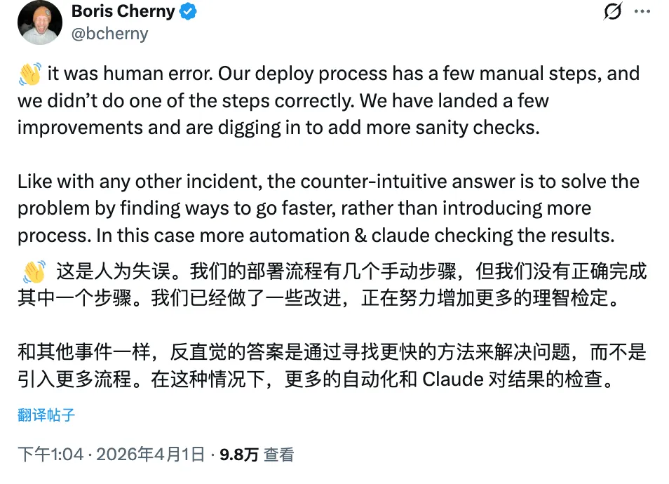 Claude Code 源码泄露事件突发!Anthropic产品负责人@Boris Cherny亲自回应:“人为失误,但我们要用AI加速,而不是加流程