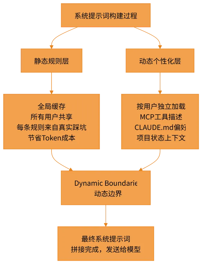 读到这里,我的第一感受是:这些规则没有一句是废话,也没有一句是”正确的废话”。所谓”正确的废话”,就是那种听起来很对、但对模型行为没有任何约束力的表述,比如”请保持专业””请尽量准确”。Claude Code 的静态规则层里,几乎找不到这类表述。每一条规则都非常具体,具体到你可以想象出它背后的失败场景。”不要随意删除用户文件”——这背后一定有某个版本的 Claude 把用户文件删光了的真实事故。”不要添加用户没有要求的功能”——这背后一定有某个版本的 Claude 把一个简单需求”优化”成了一个用户完全不认识的复杂系统。这些规则,是从真实的生产失败里蒸馏出来的产品知识。更重要的是,这一层内容会被全局缓存。全球几百万用户共用同一份静态规则,不需要每次请求都重新加载和计算,极大地降低了整体的 token 成本。第二层:动态个性化层(按用户独立加载)这一层与静态层完全相反:内容因人而异,按项目状态动态拼接,每次请求都可能不同。它包含的内容大致有: