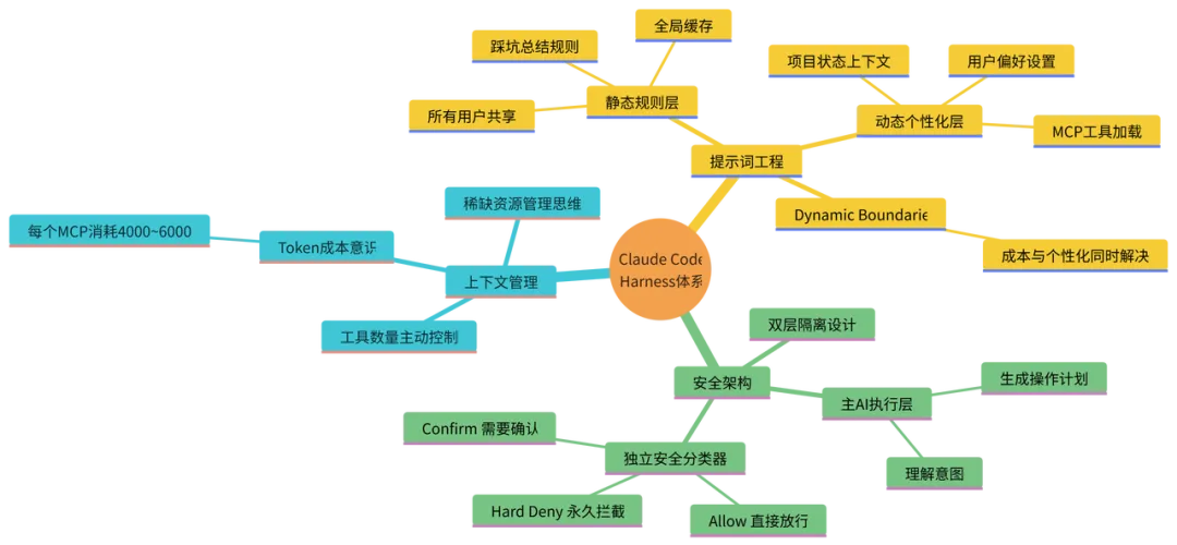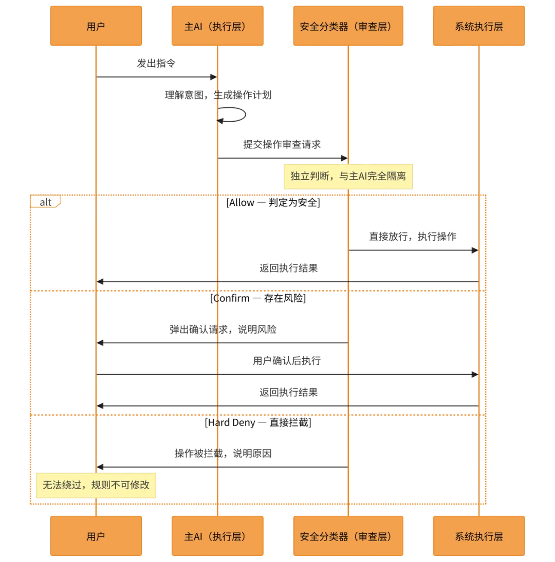 这一层让每个用户的 Claude Code 都有自己的”个性”,同时又不影响全局规则的稳定性。2. Dynamic Boundaries:一刀切出两个世界Anthropic 在这里做了一个让我印象极深的架构设计,叫 Dynamic Boundaries——动态边界。它的核心思路用一句话说清楚:把”所有人都需要的规则”和”每个人独有的上下文”,在系统层面明确切开,分别处理,分别缓存。这条边界线,同时解决了两个长期矛盾的产品问题成本控制:静态规则层全局缓存,不需要每次请求都重新计算,节省大量 token 开销。个性化体验:动态层独立加载,保证每个用户的 Claude Code 都能感知到自己的偏好和项目状态。这两个目标,在没有 Dynamic Boundaries 之前,是互相矛盾的——要个性化就要每次重新加载,要节省成本就要牺牲个性化。Dynamic Boundaries 用一个架构决策,把这个矛盾化解了。产品启示: 系统提示词的质量,本质上是产品经理对用户场景理解深度的直接体现。大多数 AI 产品的提示词写得平庸,不是因为工程师不努力,而是因为没有人认真做过”哪些规则是所有用户共性需要的,哪些内容是每个用户独有的”这个分析。这是产品经理的责任,不是工程师的。更进一步说,提示词里每一条具体规则的背后,都应该有一个真实的用户失败场景作为支撑——如果你写不出这个场景,这条规则大概率是废话。第四章:发现二——Claude Code 背后,其实跑着两个 AI如果你用过市面上多款 AI 编程工具,大概率遇到过这样的噩梦:让 AI 帮你重构一个函数,结果它顺手把相关的三个文件也”优化”了,而且改得面目全非。让 AI 跑一条测试命令,结果它直接执行了一条你没想到的清理命令,把本地环境搞乱了。一步操作走错,项目陷入混乱,回滚都困难。这类事故在 AI 编程工具的早期版本里极为常见,也是很多开发者不敢在真实项目里用 AI 工具的核心原因——不是不信任模型的能力,而是不信任模型的边界感。而 Claude Code 给人的一个非常强烈的感受是:稳。它很少”翻车”。即使在 auto 模式下,它对高风险操作的处理也明显比其他工具保守和谨慎。用它做开发,你不会时刻提心吊胆,不会觉得需要一直盯着它防止它做出什么意外的事情。源码告诉了我背后的原因。1. 一个 AI 负责干活,另一个 AI 专门”审判”在 Claude Code 的源码里,有一个文件名非常有意思,叫 yolo-classifier。YOLO,You Only Live Once,活在当下,放手去干。但这个文件实际做的事情,和 YOLO 精神完全相反——它是整个系统里最谨慎、最保守的一个模块。每当主 AI 想要执行一个操作——比如写文件、运行 shell 命令、修改系统配置、调用外部 API——都不会直接执行,而是先触发这个独立的安全分类器。这个分类器有完全独立的系统提示词,和主 AI 的提示词毫无关联,它的职责只有一个:判断这个操作,安不安全。它的判断结果只有三种,没有模糊地带,没有”视情况而定”: