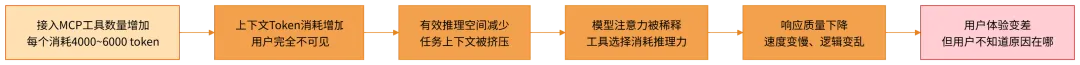 Claude Code 的安全机制,就是这样一套分层的、有明确边界的、不依赖单点判断的门禁体系。Claude Code 很少”翻车”,不是因为它的模型从不犯错,而是因为错误在到达用户之前,就被独立的安全层拦截了。产品启示: AI 产品的安全感,不是靠”模型更聪明”来解决的,而是靠工程架构设计出来的。这是产品经理需要主动推动的决策——你需要问清楚:我们的产品里,有没有独立于主模型的安全审查层?这个层的判断逻辑是谁来定义的?哪些操作属于 Hard Deny,这个清单是怎么来的,谁来维护?这些问题如果没有清晰的答案,AI 产品的稳定性就永远依赖运气,而不是设计。第五章:发现三——工具不是越多越好,每个 MCP 都在偷吃你的上下文这是我个人觉得最反直觉、但对产品经理来说也最有实际价值的一个发现。在 AI 产品的功能规划里,有一种非常常见的思维定势:功能越多越好。工具越丰富,产品越强大。这个逻辑在传统软件产品里基本成立。多一个功能,多一个用户价值,顶多增加一点界面复杂度,对核心功能的影响几乎可以忽略不计。但在 AI 产品里,这个逻辑是危险的。源码和相关文档里明确揭示了一个大多数用户和产品经理都不知道的事实:每一个 MCP 工具的描述文件,都会消耗 4000\~6000 个 token 的上下文空间。这个数字,乍一听好像不大。但换算一下就会发现问题的严重性: