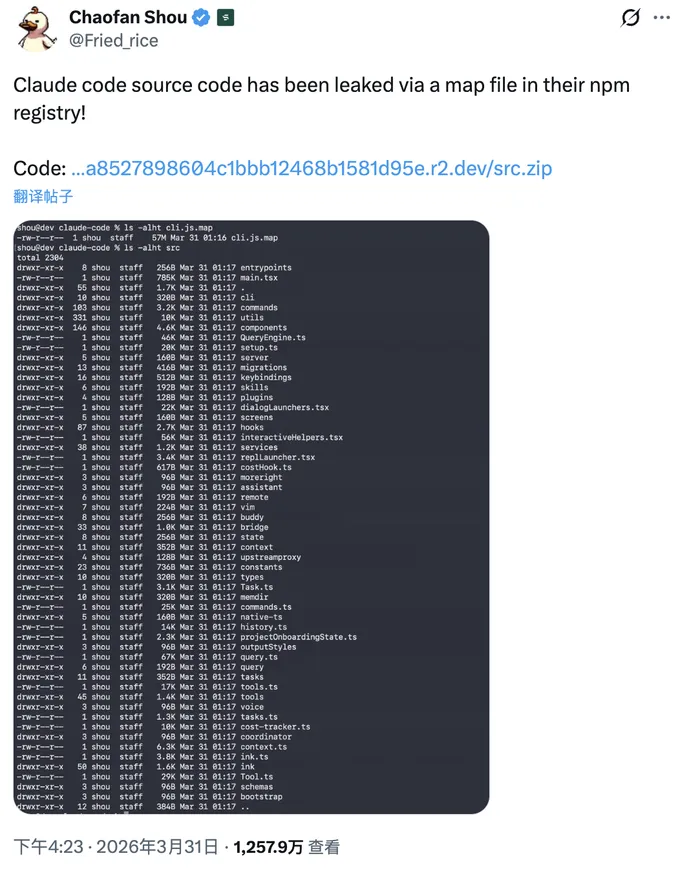 安全研究员 Chaofan Shou 在 X 上发了一条推文,附带一个下载链接。几个小时后,这条推文的浏览量突破2100万。
