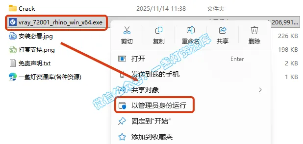 9.返回之前解压的【VRay7.2 for Rhino7-9】文件夹,打开【Crack】,全选所有文件,鼠标右键选择【以管理员身份运行】