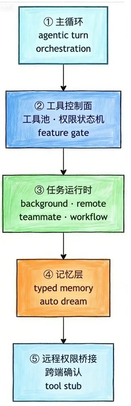 此次泄露的代码中,最具价值的并非某个隐藏功能或彩蛋,而是Claude Code已经形成的一套完整、成熟的Agent Harness架构。与传统“聊天+工具调用”的简单模式不同,这套架构已经进化为一个能独立思考、执行、记忆、跨环境协作的小型运行时系统,共分为五层,层层递进、环环相扣,覆盖了Agent运行的全流程。