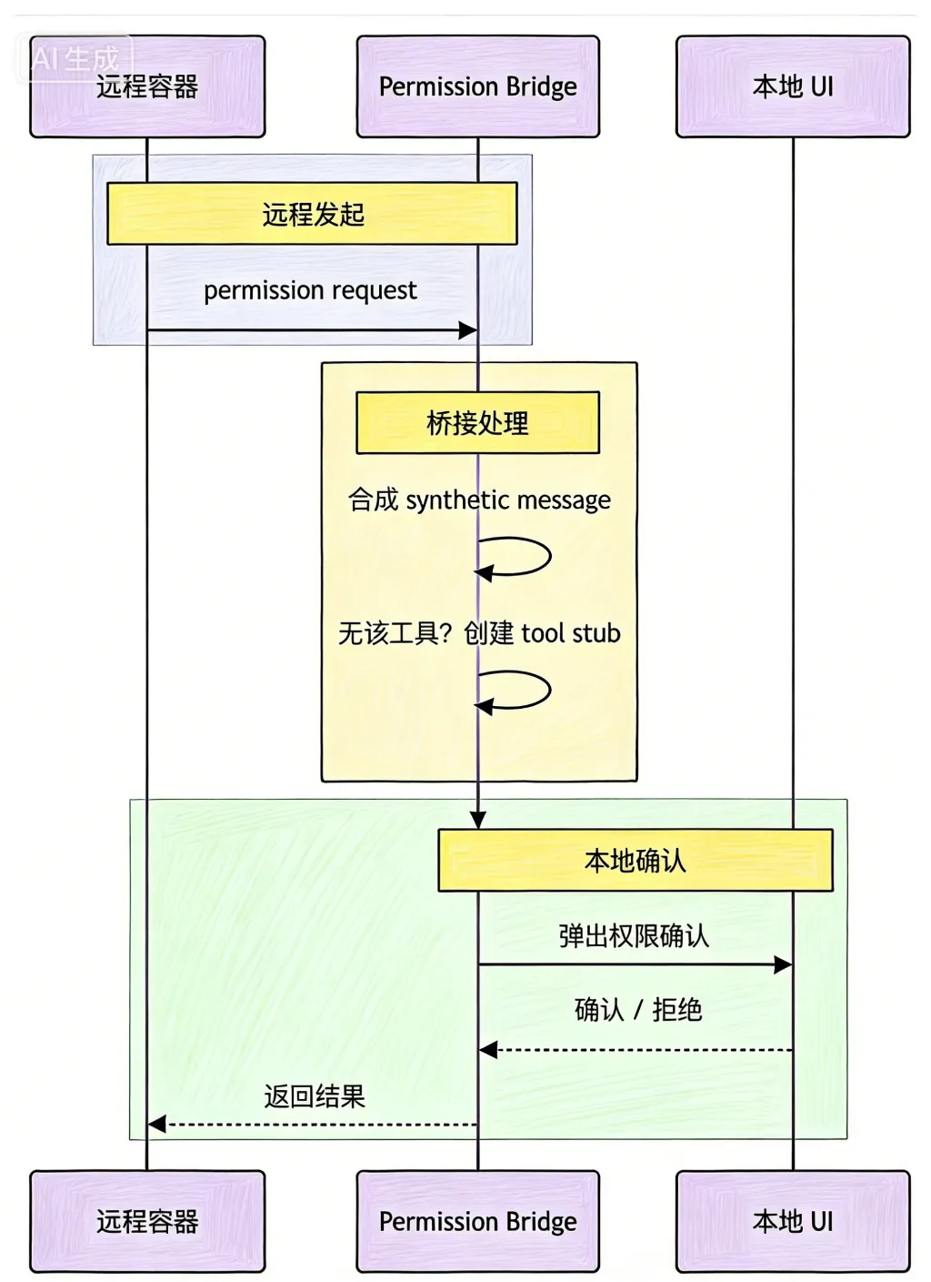 跨环境权限同步:远程容器中的权限请求,无法直接在本地UI展示,系统会合成一个synthetic assistant message(虚拟助手消息),将远程权限请求转化为本地可识别的形式;