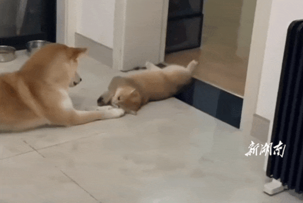 网友家的猫和狗一起躺在地板上消磨时光。