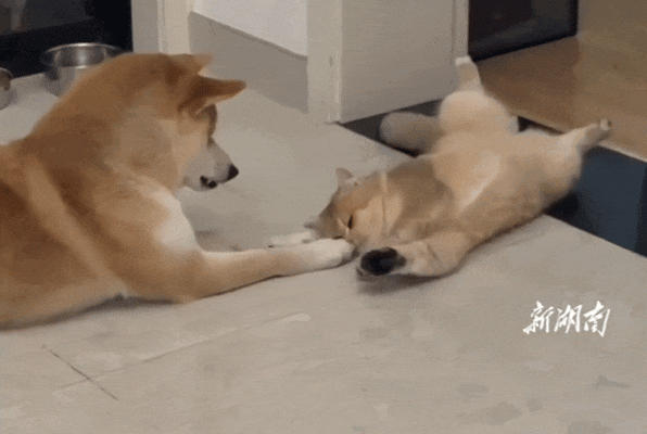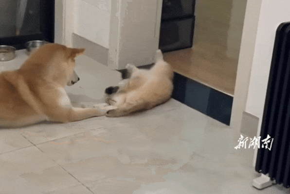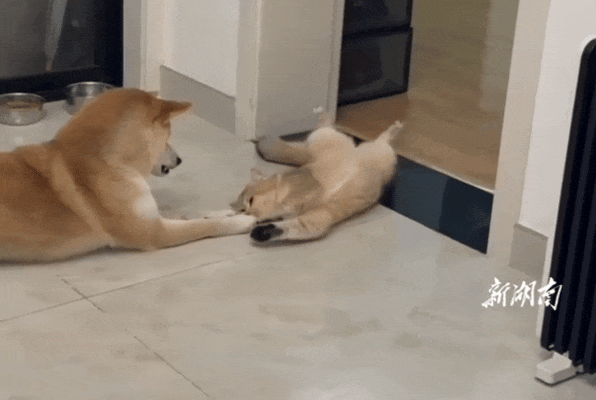 狗子趴在地上看着地上正在打滚儿的猫,猫看着狗子的玉足伸到自己的面前,忍不住想要跟狗子一起玩儿。