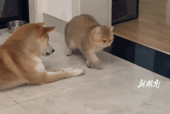 猫咪一个翻身起来,就一脸震惊的盯着面前的狗。