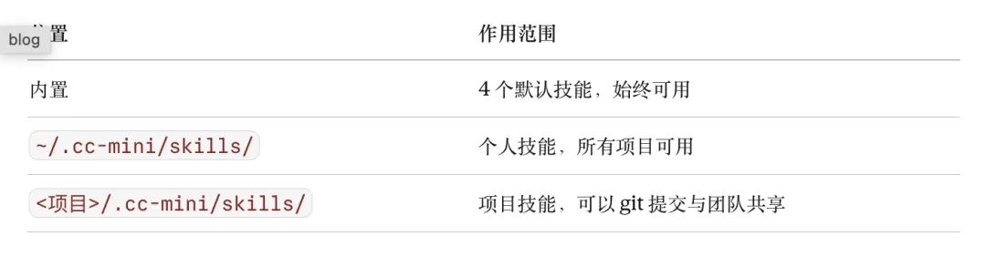 在 .cc-mini/skills/你的技能名/SKILL.md 里写一份 Markdown 提示词,就能创建自定义技能。