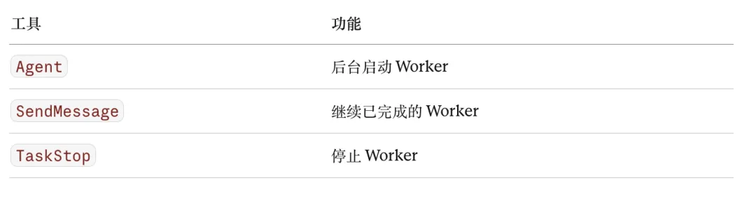 Worker 可以独立完成:研究代码库、实现某个改动、验证结果……完成后把结果以 <task-notification> 消息的形式注入主对话,协调者再综合决策。
