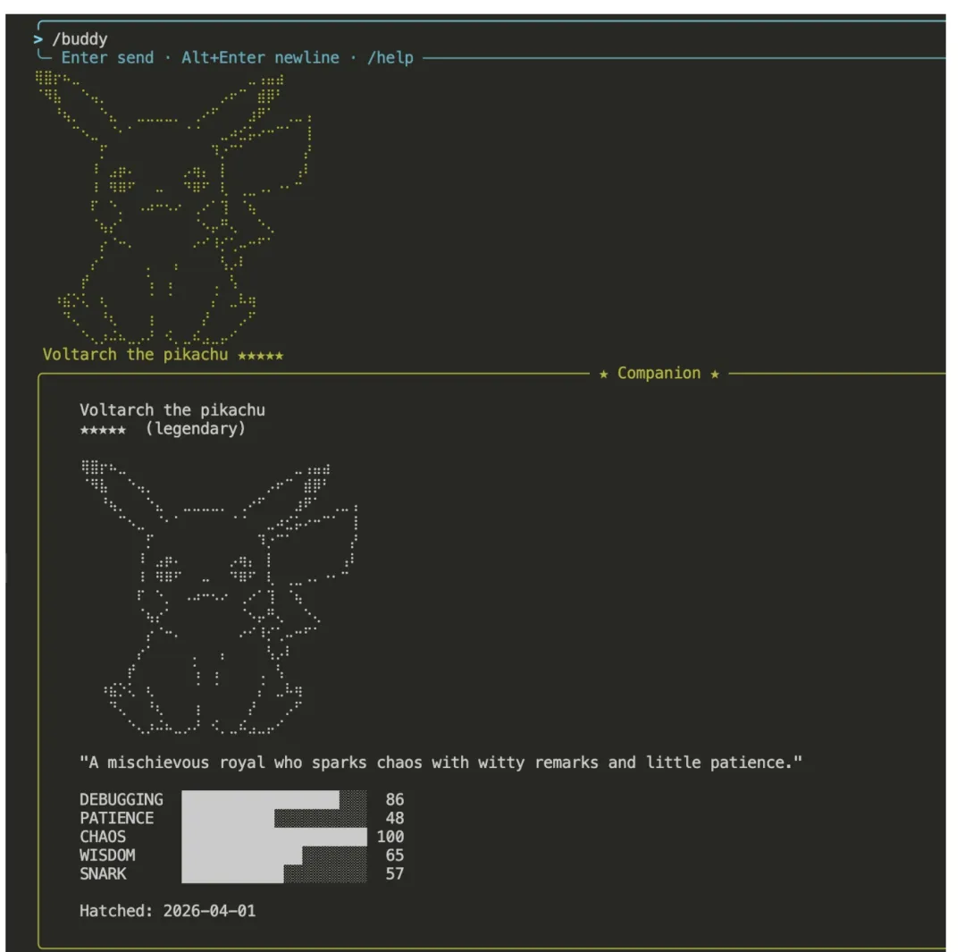 每个用户的终端里会住着一只 AI 宠物,它看你写代码,偶尔在气泡里发表评论: