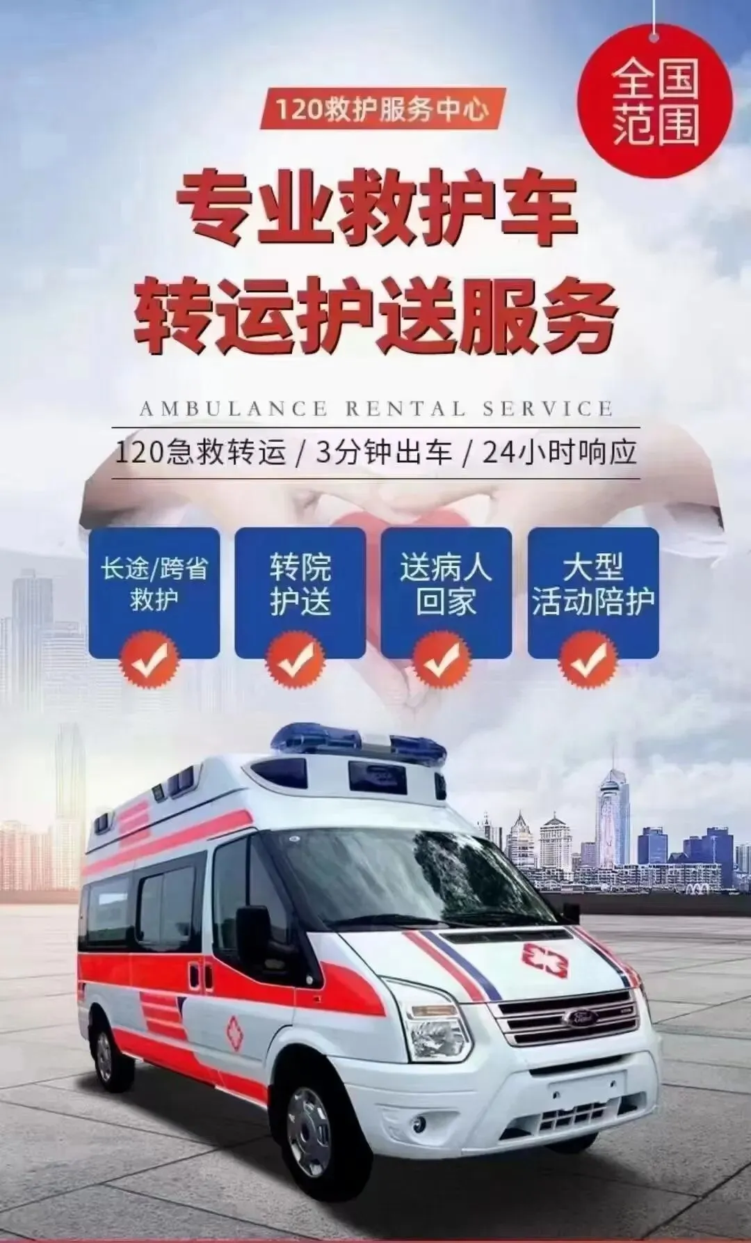我们是救护车出租转运公司,120救护车接送病人预约护送。24小时为术后康复、危重患者及跨区域就医人群提供专业医疗转运服务,提供120救护车转运出租‖跨省长途转运‖危重病人转运‖市内转运‖术后康复病人转运‖高铁病人转运‖患者返乡‖车上配备ICU设备:呼吸机▪心电监护仪▪吸痰器•微量泵•氧气▪急救药箱▪专业医护团队,私人120救护车转运24小时服务热线:15088098120(←长按复制,微信同号)