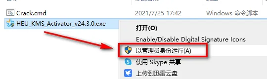 7.选中HEU_KMS_Activator,鼠标右键点击“以管理员身份运行”
