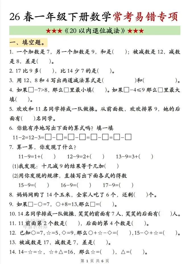 今天给大家整理了26新一年级下册数学20以内退位减法常考易错专项,转发给朋友或班级群,受益更多人,帮助孩子学习!