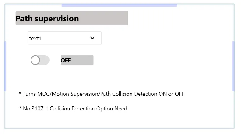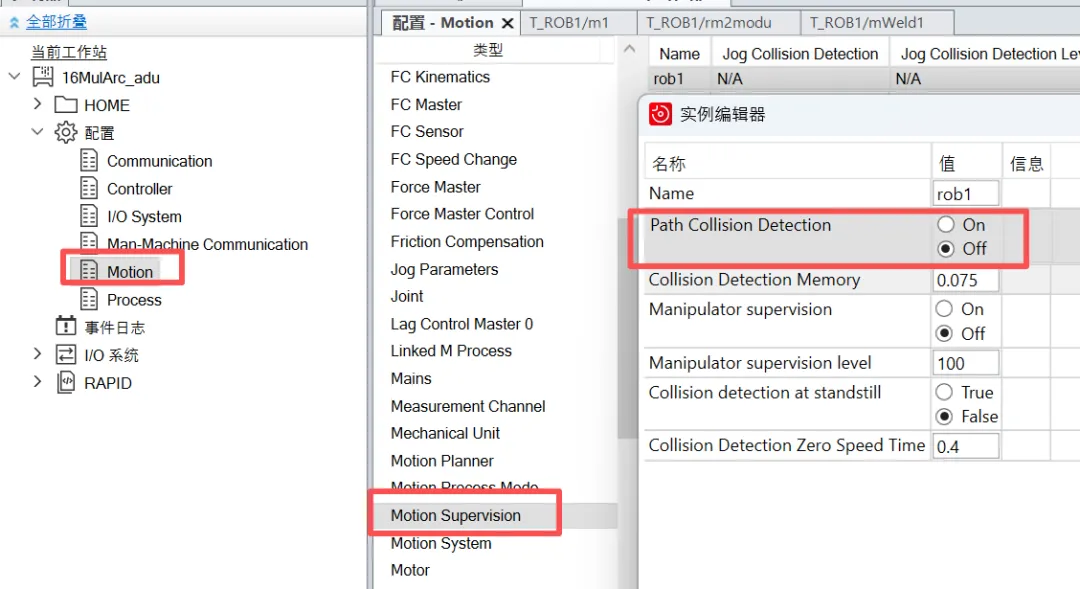实际上,如果没有3107-1选项,用户仍可以通过RobotStudio,在配置-motion-motion supervision 对path collision detection关闭。jog collision detection以及灵敏度调节需要3107-1选项。