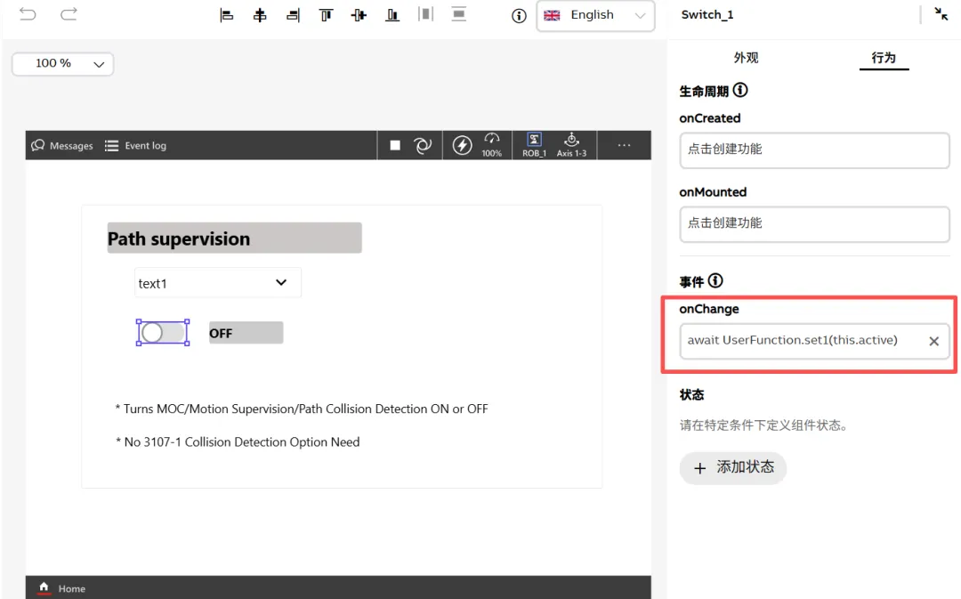1. 在AppStudio创建如下界面(下拉框用于显示有几个机器人),Swtich和text用于调整和显示路径碰撞开关状态