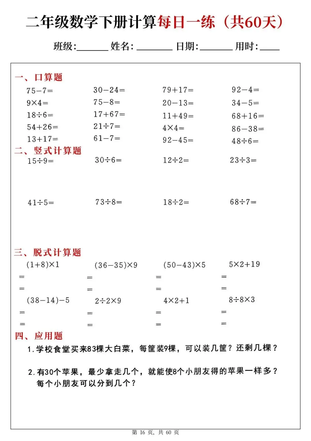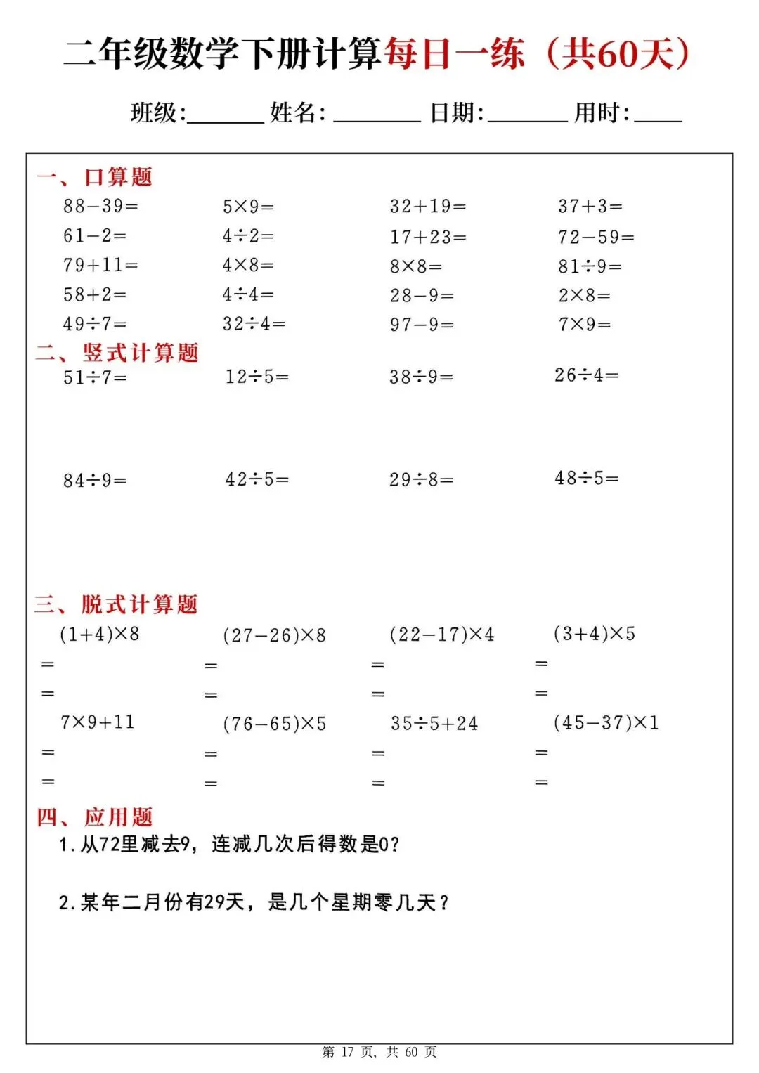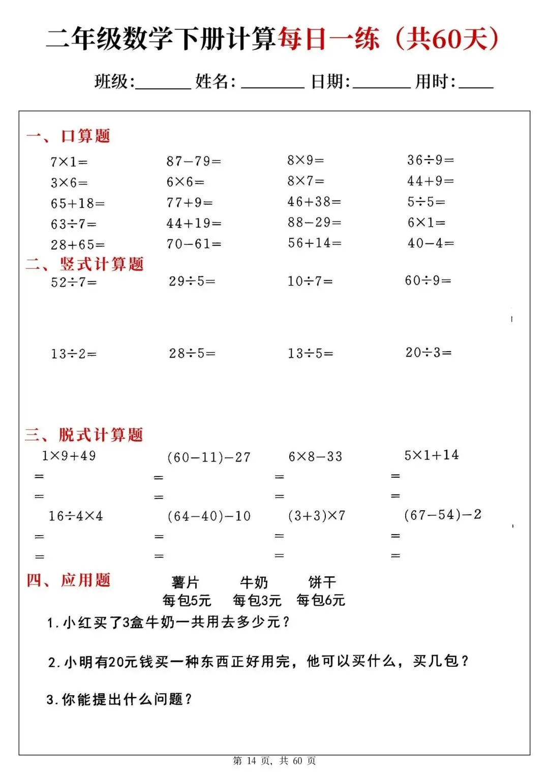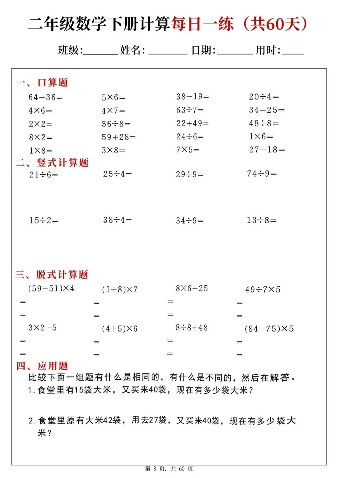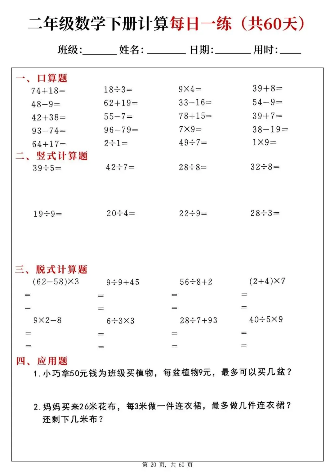 二年级下册数学每日一练PDF电子版,共60天,每天一页,题型全:口算、竖式、脱式、应用题都有,题量充足,适合巩固计算能力,家长辅导、学生练习都很方便