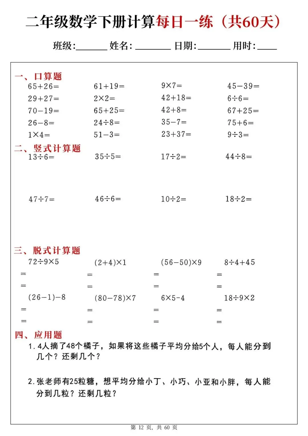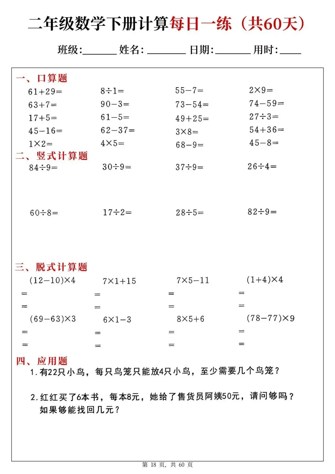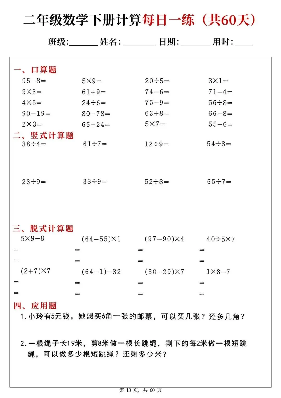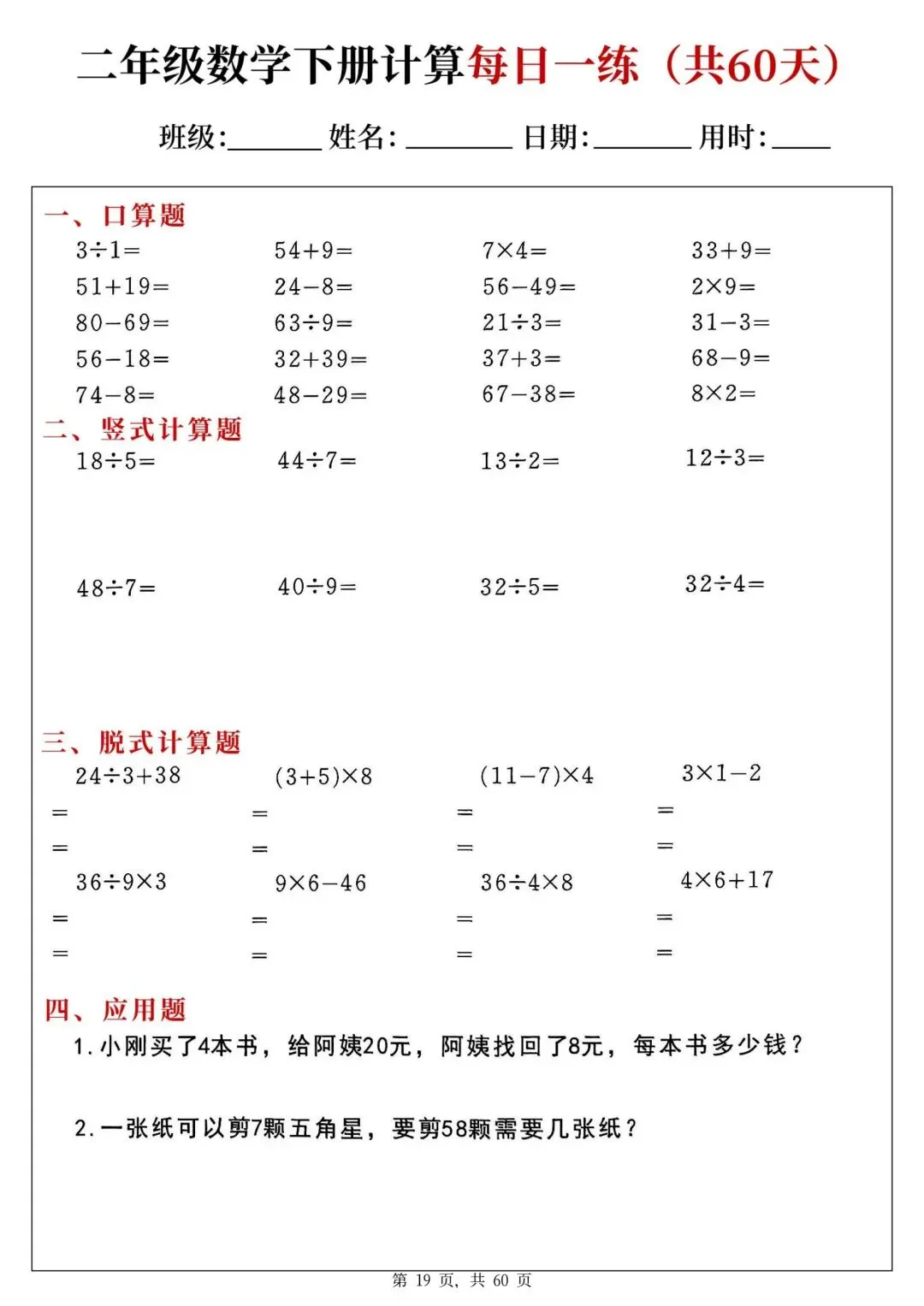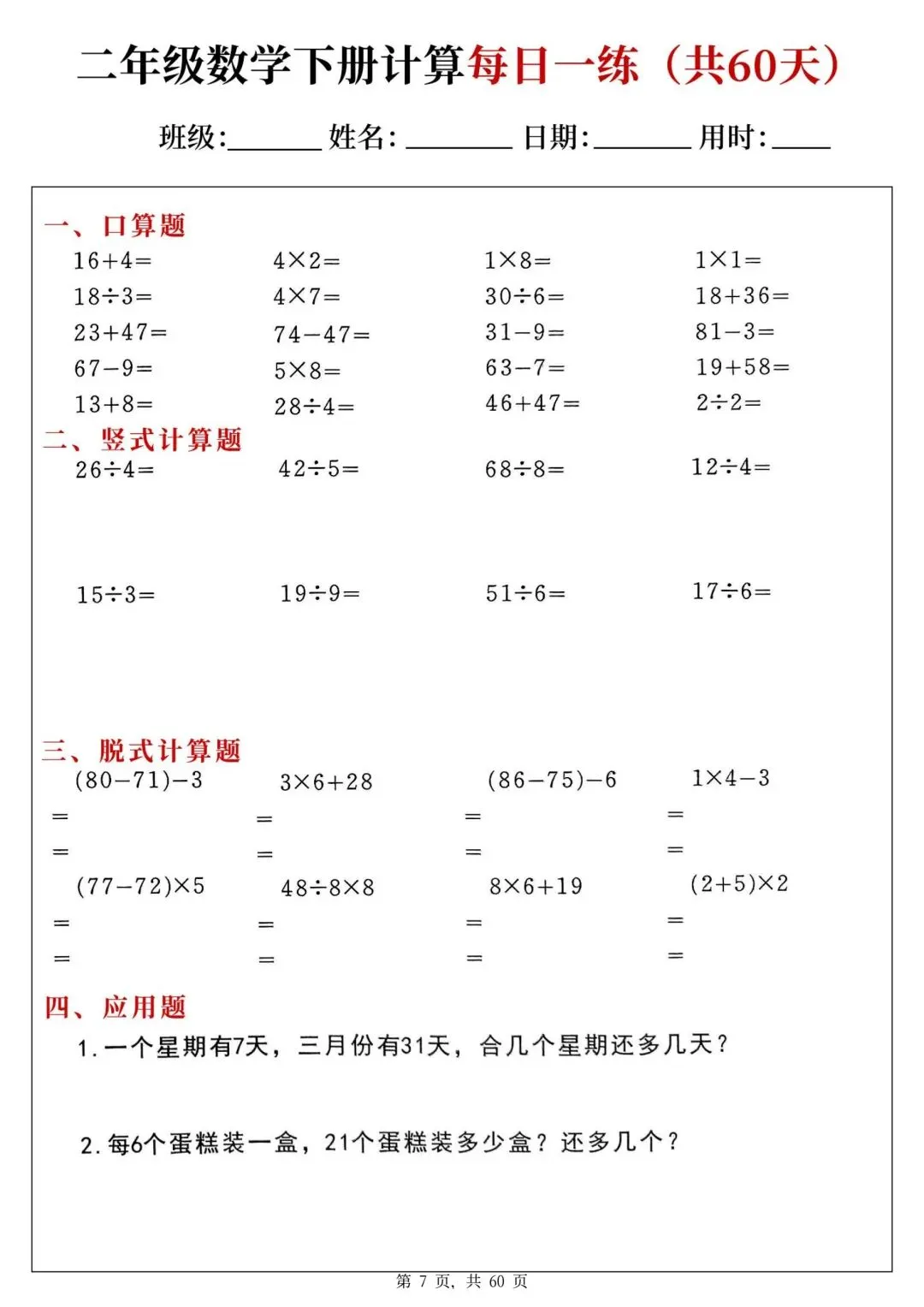 二年级下册数学每日一练PDF电子版,共60天,每天一页,题型全:口算、竖式、脱式、应用题都有,题量充足,适合巩固计算能力,家长辅导、学生练习都很方便