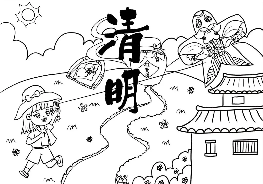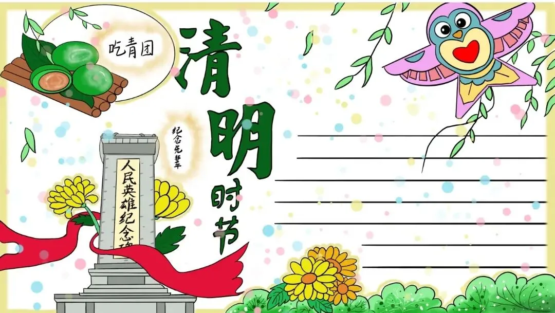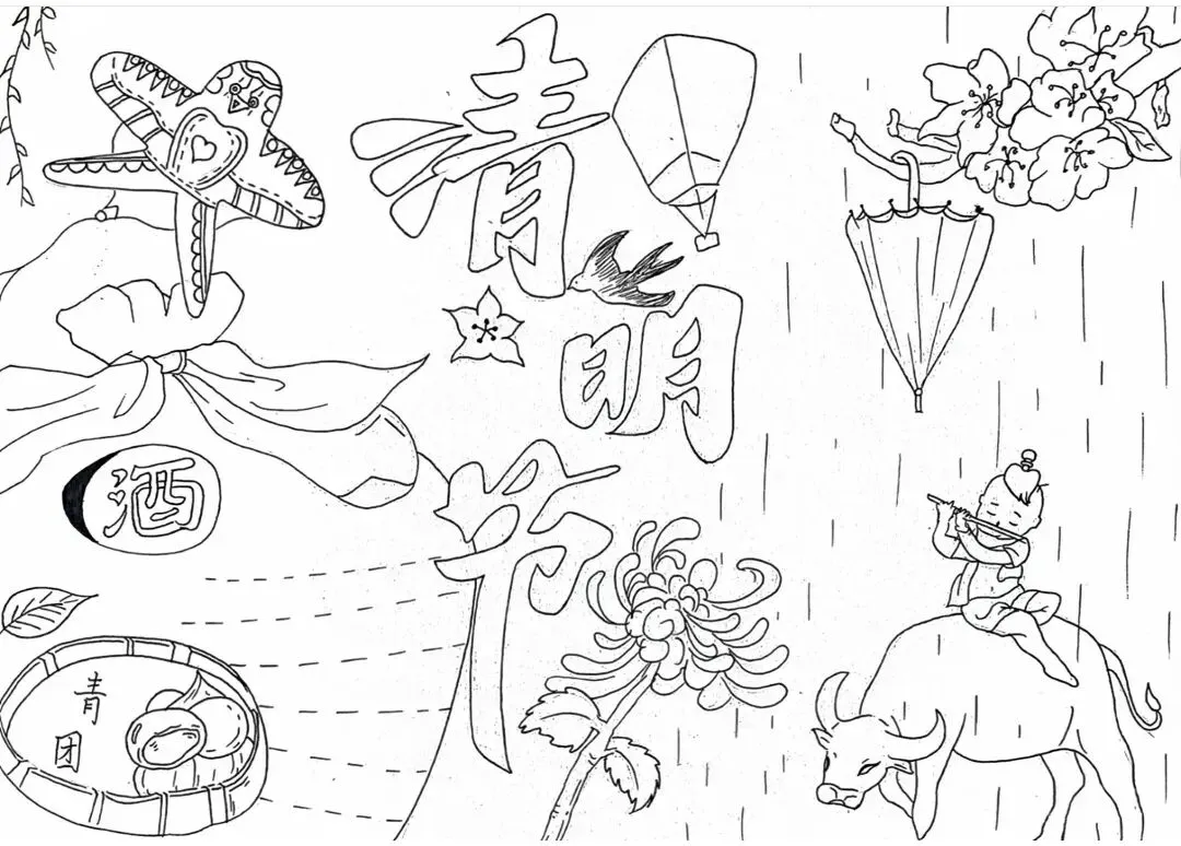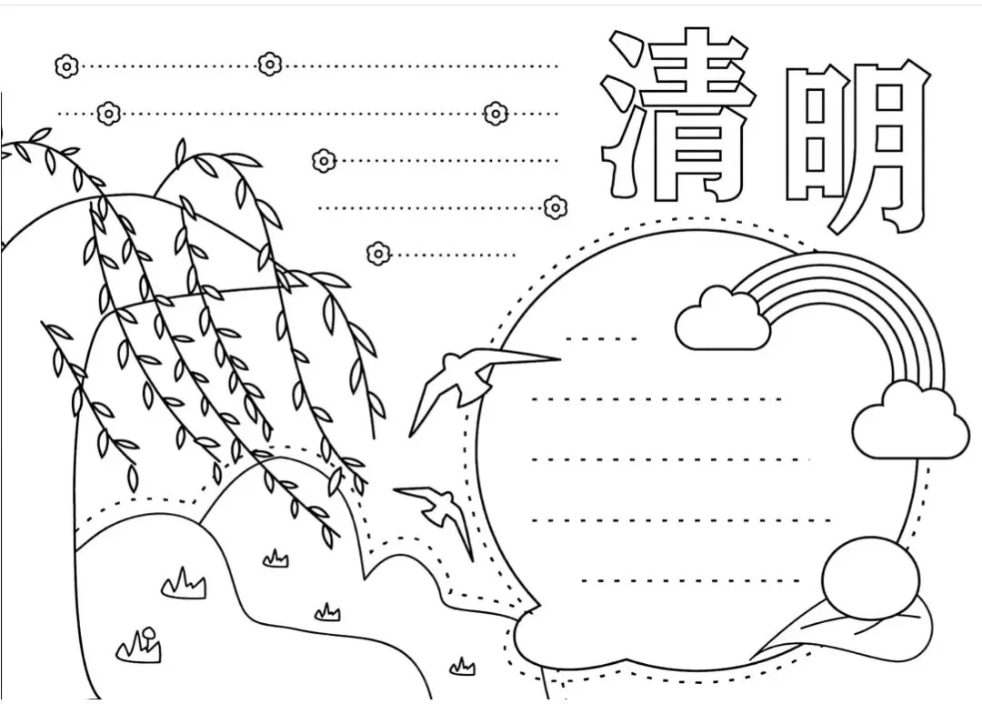 (画面设计:在手抄报的中间部分,可以绘制几幅小图,分别展示清明节的传统习俗。如扫墓的场景,人们手持鲜花、纸钱,在墓碑前默哀;踏青的画面,一家老小在春日里郊游、赏花;还有放风筝、荡秋千等儿童喜爱的活动。)