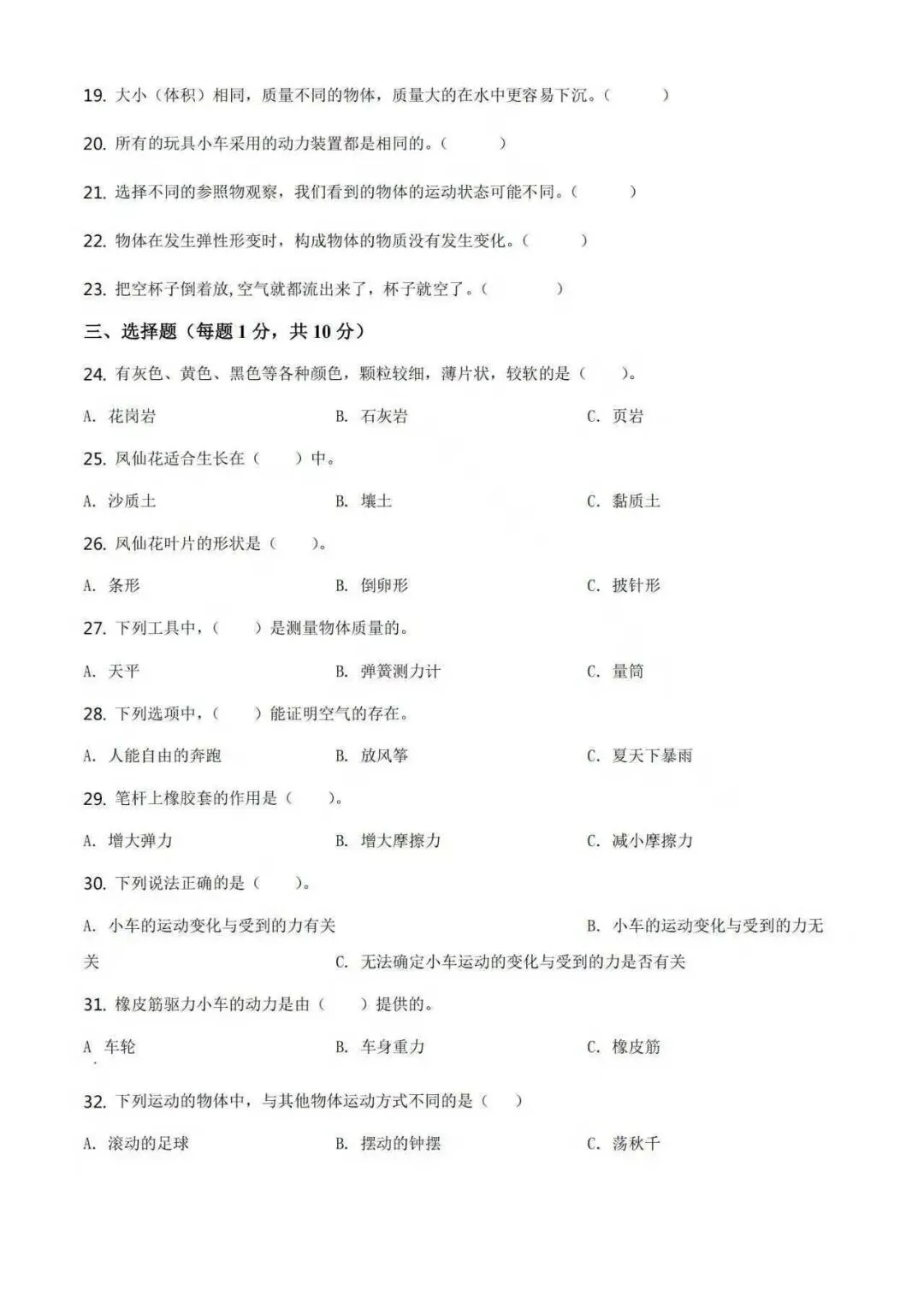 【认养闲鱼】三年级下册科学期末测试题PDF高清可打印版|期末复习必备|免费领