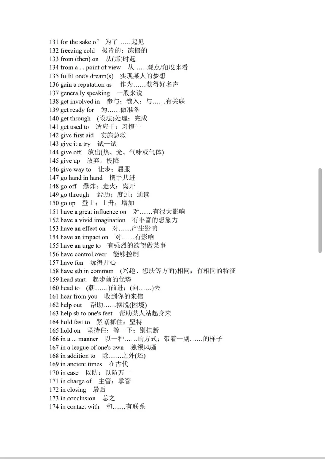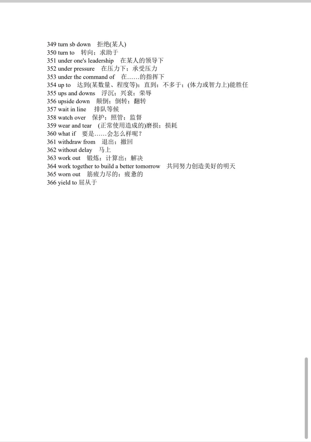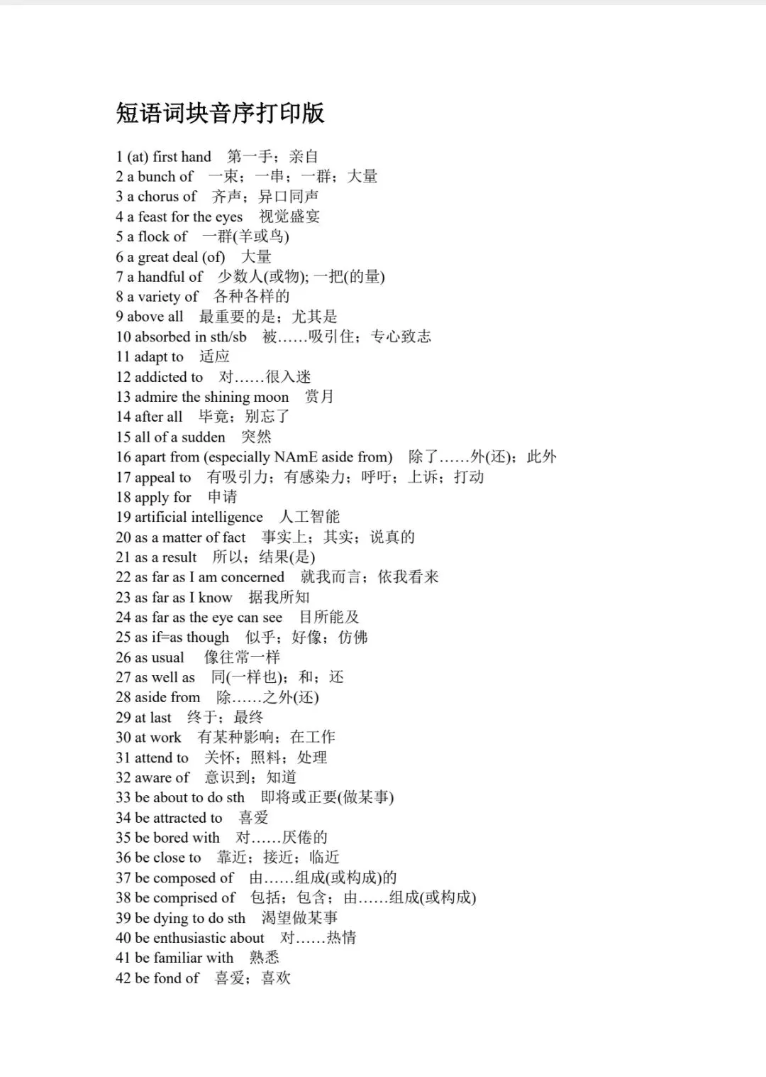 高中英语必背短语词块音序排列打印版9页完整复习资料|可打印 给大家整理了9页高中英语新教材短语词块汇编,需要完整可打印版的关注本号,回复【短语词块】就可以领取。 完整版可直接打印给孩子复习用。 整理不易,且用且珍惜!