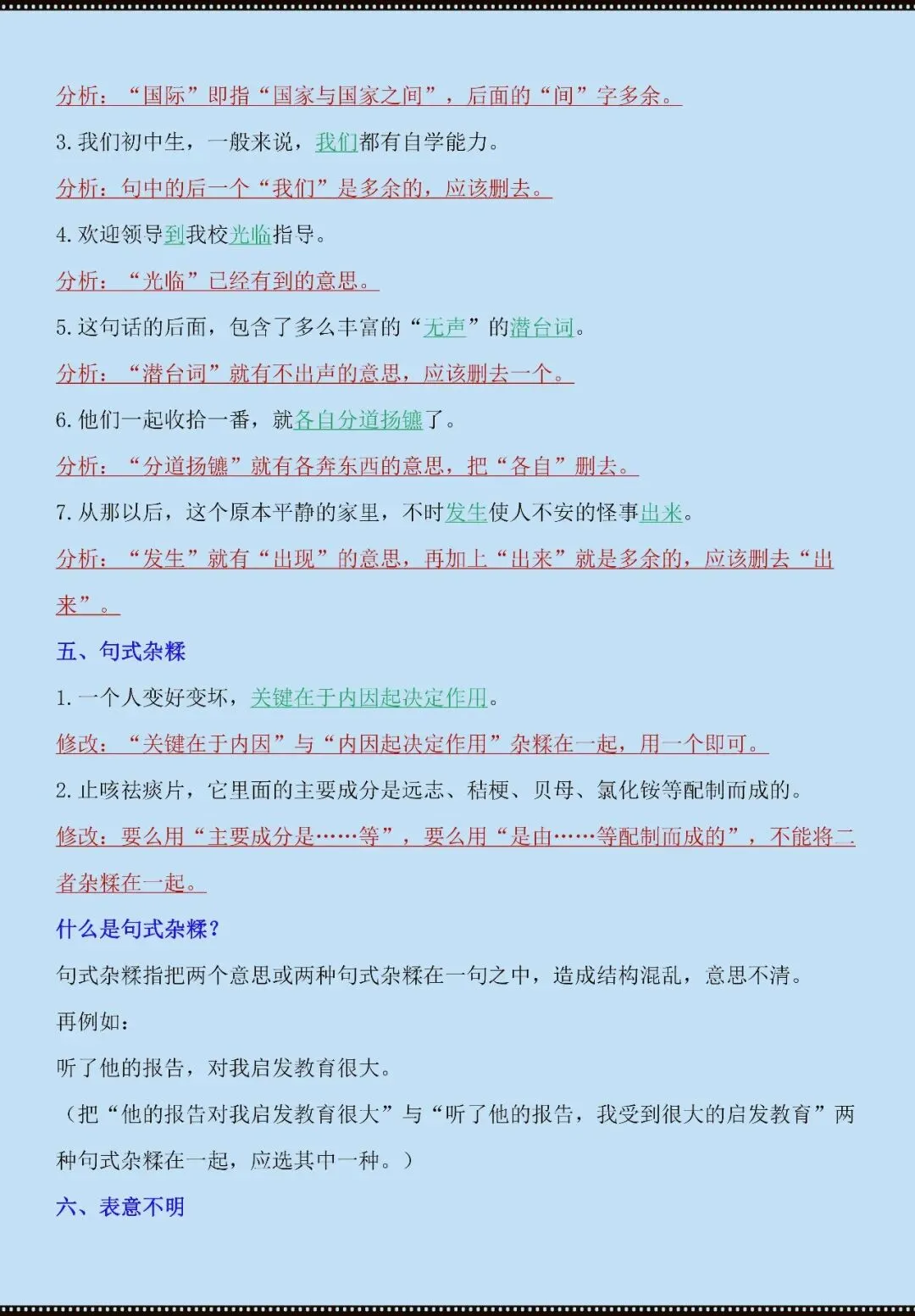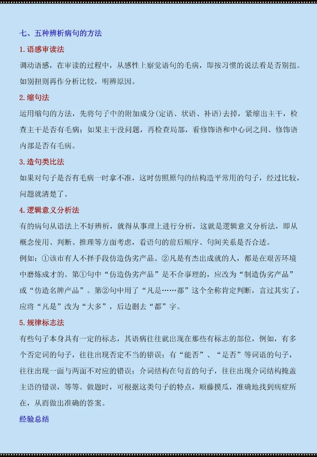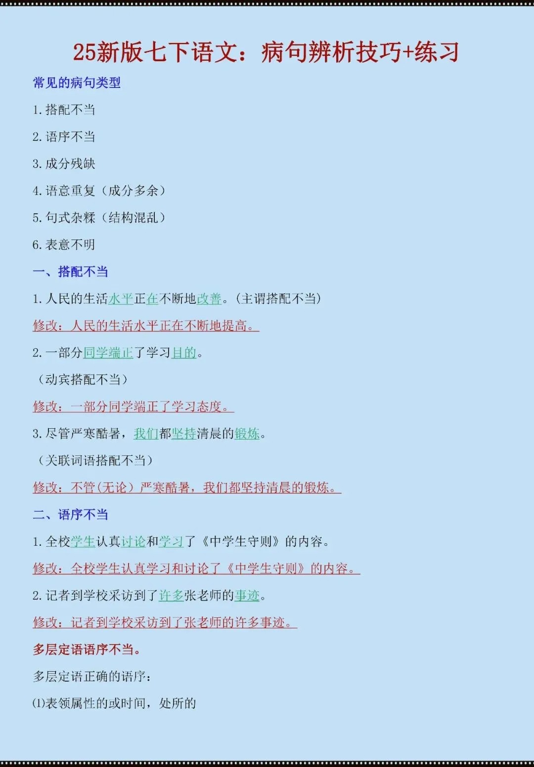 今天老师给大家整理了:七年级下册语文病句辨析技巧+练习(电子版可打印)
