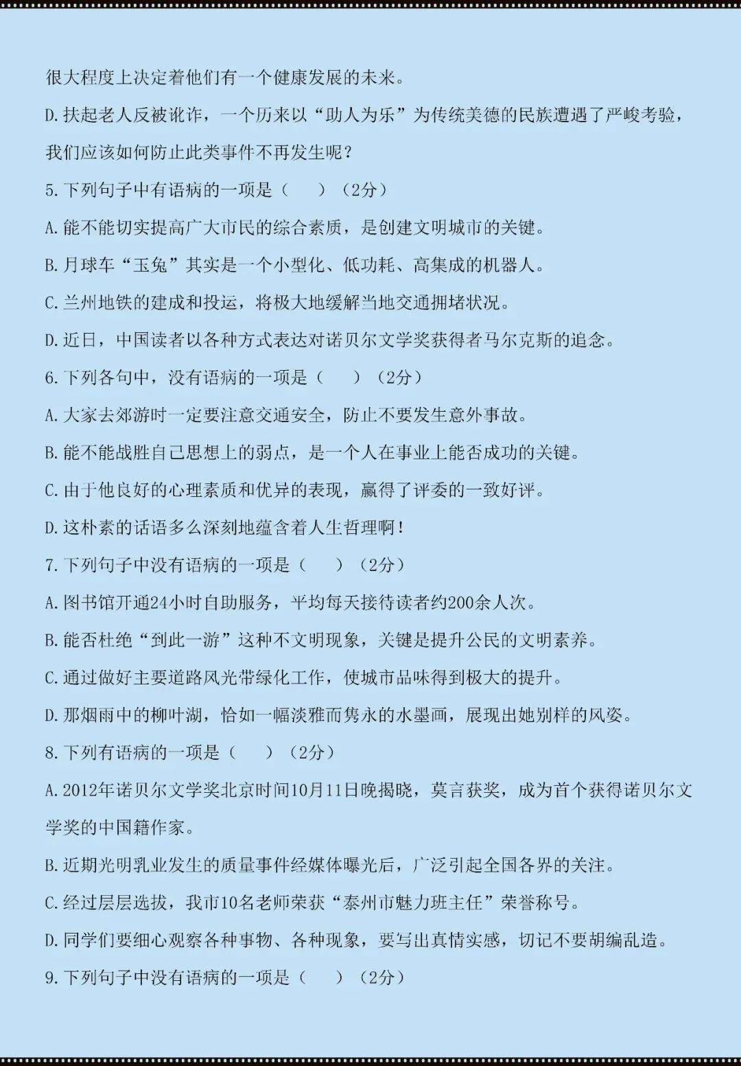 七年级下册语文病句辨析技巧+练习(电子版可打印)