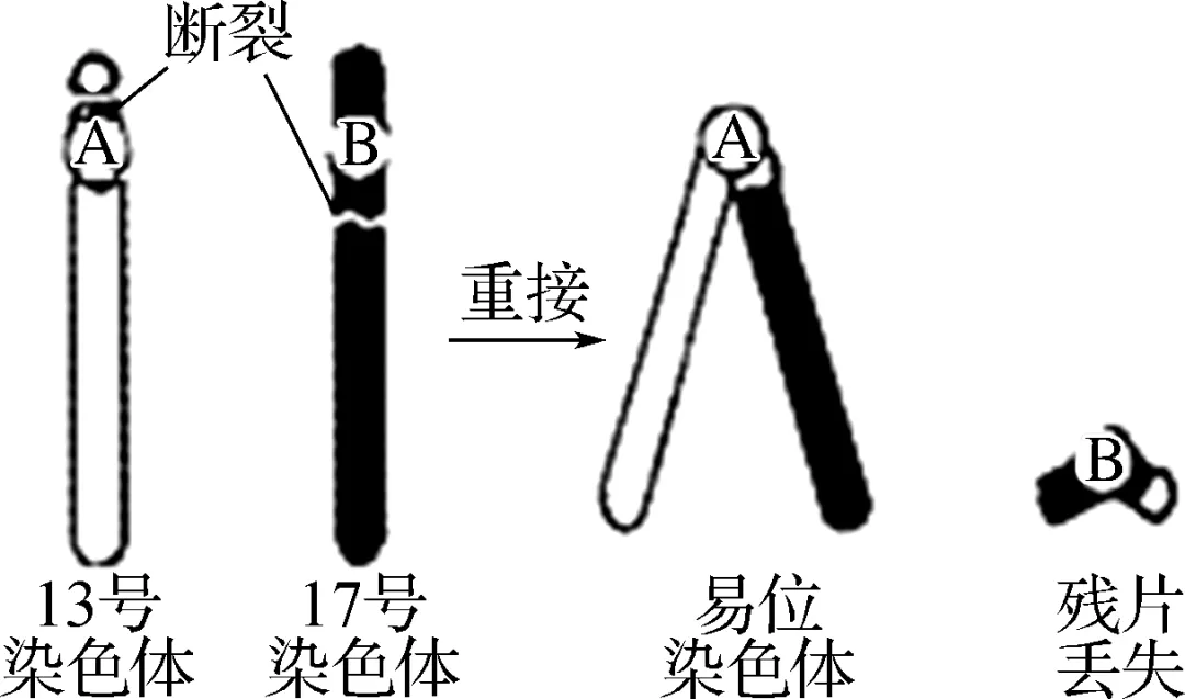 【解析】因为13和17号染色体的易位,形成了一条易位染色体和残片,所以图中发生了染色体结构变异(易位)和染色体数目变异(残片丢失),A正确;易位纯合公猪含有2个异位染色体,有2个残片丢失,故体细胞内只有36条染色体,初级精母细胞中仍然是36条染色体,B错误;易位杂合子含有易位染色体和正常13、17号染色体,它们均不能形成正常四分体,其他正常染色体(34条)可以形成17个正常的四分体,C正确;易位杂合子含有易位染色体和正常13、17号染色体,其有可能产生染色体组成正常的配子,D正确。