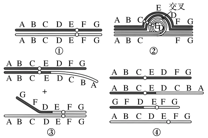 【解析】对比图①④中最上面一条染色体及着丝粒位置,再结合题干信息,染色体片段DE发生了臂间倒位,A错误;倒位环内的非姐妹染色单体间的单交换发生在四分体时期,即减数分裂Ⅰ前期,B正确;由图④的交换结果可知,交换的产物(中间2条染色体)都带有缺失或重复,不能形成有功能的配子,C正确;精原细胞经过正常减数分裂后形成2种类型的4个精细胞,当四分体时期同源染色体上非姐妹染色单体发生片段交换后可产生4种配子,D正确。
