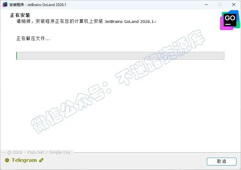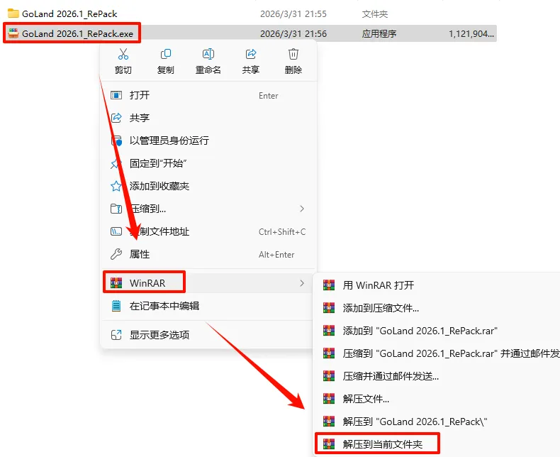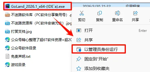 2.打开刚刚解压的文件夹,鼠标右键点击“GoLand_2026.1_x64-(IDE`a).exe”选择“以管理员身份运行”