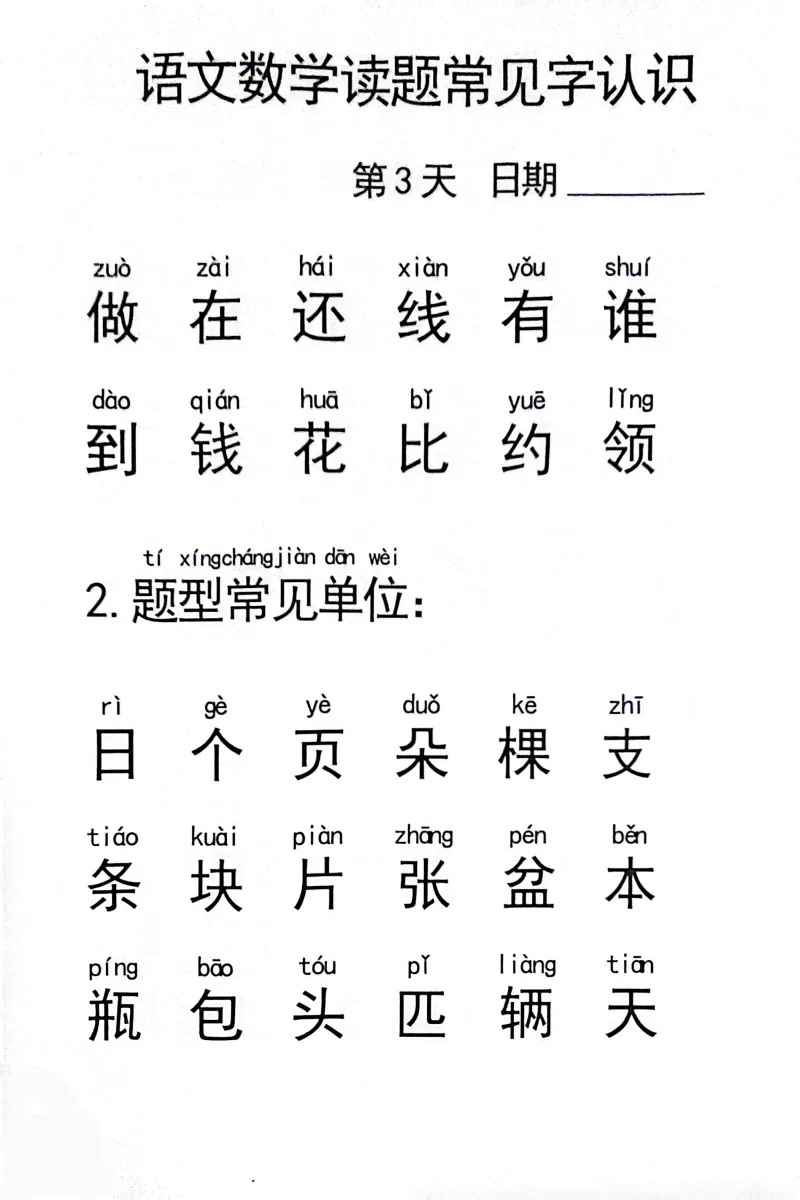 幼小衔接不管识字量多少,都要把这些语文数学读题常见字认会,不然到时候做题都读不懂题干。它包含一年级语文数学读题常见字,共44页,电子版可下载。需要的家长可以打印出来,让孩子每天学一页,字量适中,轻松应对一年级。(温馨提示:文末有资料获取方式)