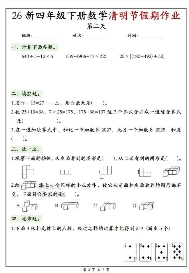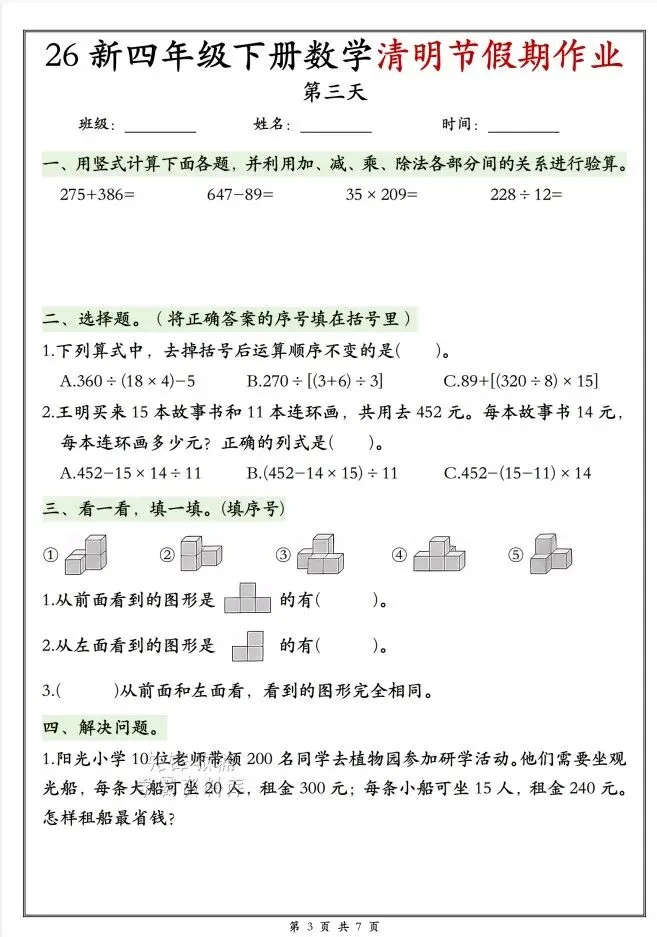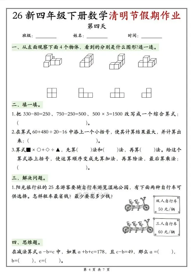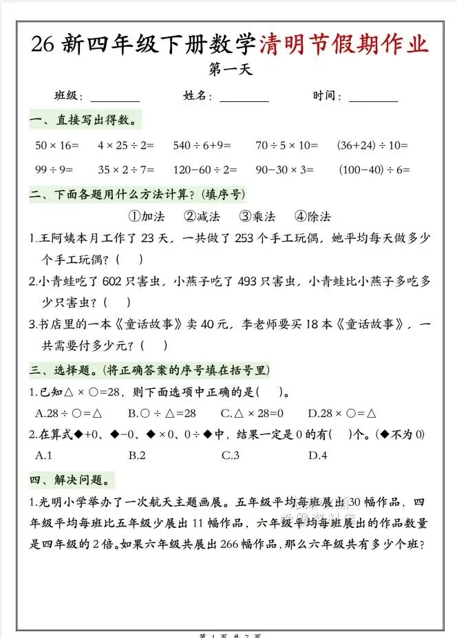 今天给大家整理了26新四年级下册数学清明节假期作业,转发给朋友或班级群,受益更多人,帮助孩子学习!