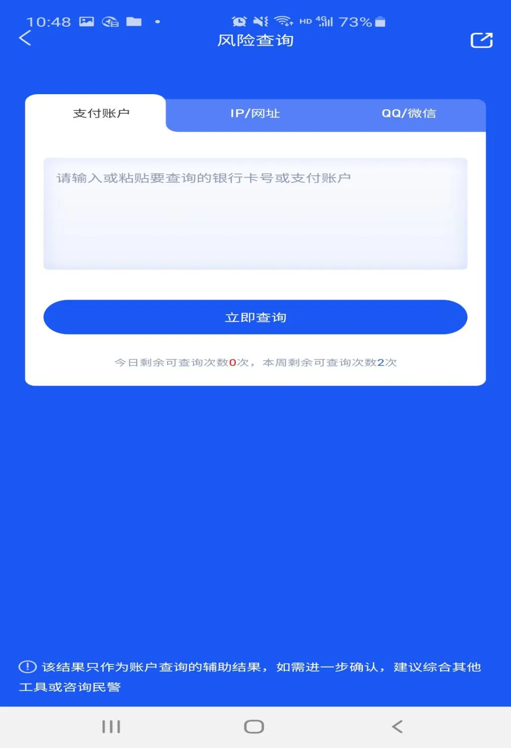 ● 通过“风险查询”,进行手机支付风险核验。