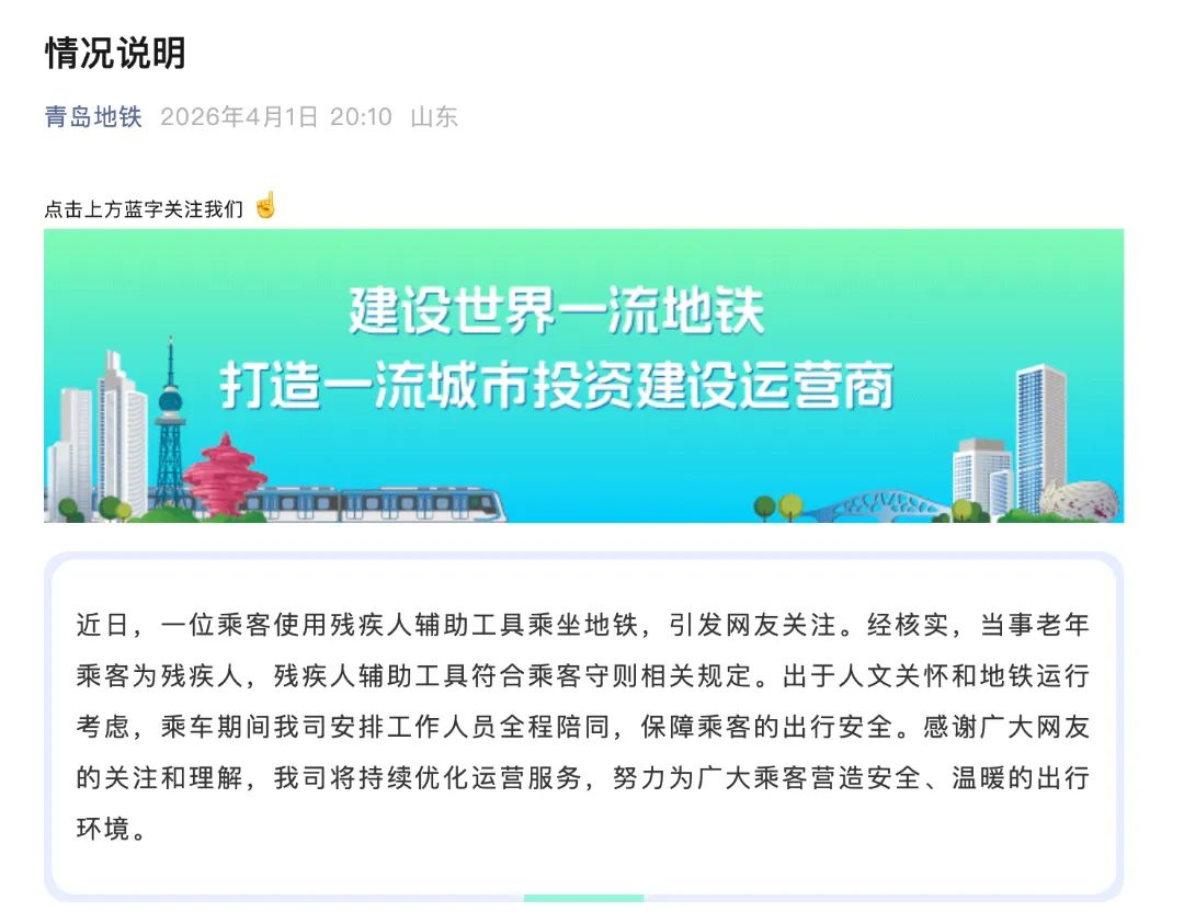 近日,一位乘客使用残疾人辅助工具乘坐地铁,引发网友关注。经核实,当事老年乘客为残疾人,残疾人辅助工具符合乘客守则相关规定。出于人文关怀和地铁运行考虑,乘车期间我司安排工作人员全程陪同,保障乘客的出行安全。感谢广大网友的关注和理解,我司将持续优化运营服务,努力为广大乘客营造安全、温暖的出行环境。