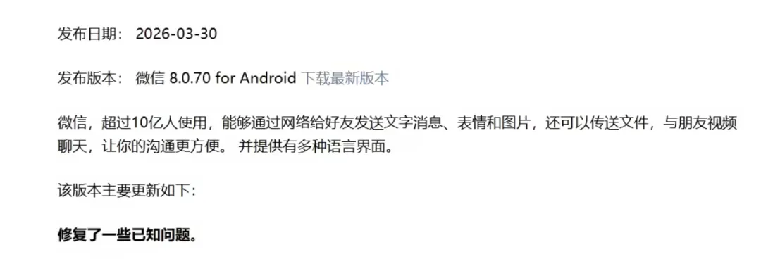 3 月 30 日,微信安卓8.0.70正式版低调上线。虽然官方日志依然是那句万年不变的“修复了一些已知问题”,但经过深度实测,我们发现这次更新其实“内有乾坤”。