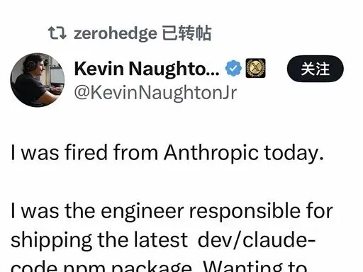 4月1日 负责发布的工程师Kevin Naughton Jr.被解雇,X账号清空,只留一句自爆:”I was fired from Anthropic today. I was the engineer responsible for shipping the latest dev/claude-code npm package…”