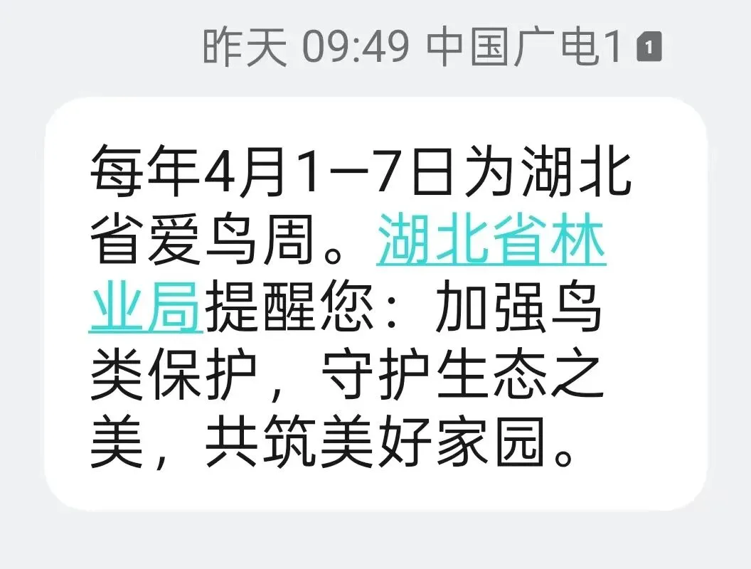 4月1日清晨,一条来自湖北省林业局的短信映入眼帘:“每年4月1—7日为湖北省爱鸟周。省林业局提醒您:加强鸟类保护,守护生态之美,共筑美好家园。”