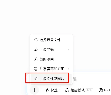 1.点击对话框左下角的“+”,选择“上传文件或图片”