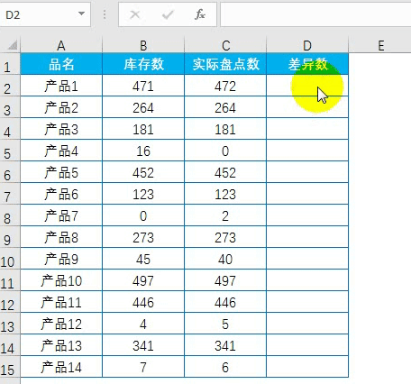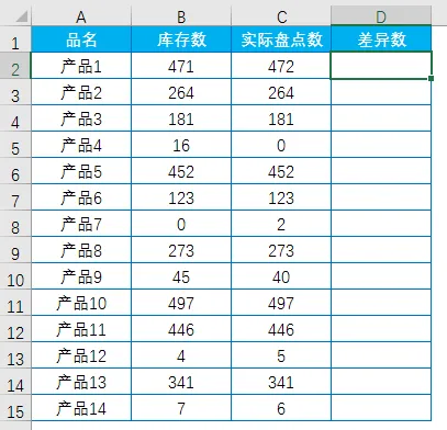 在D2单元格输入公式:=B2-C2