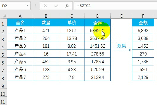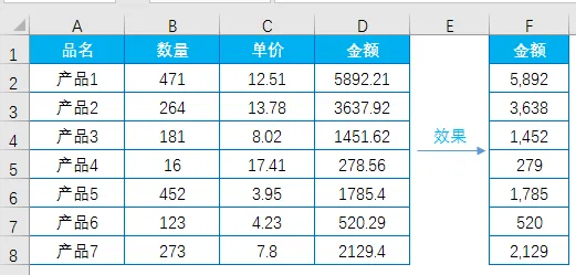 比如要将金额四舍五入取整,效果如F列,该怎么操作呢?