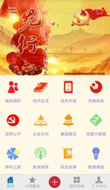 “党员版APP”界面设计以红色和黄色为主色调,将党徽、先行等党建元素与高铁动车、成昆雕塑等铁路元素相融合,并融入集团公司“争创一流、西部领先”的奋斗目标,既突出了党味儿,又展现了行业特色。首页设置了12个一级模块,包括我的组织、党内生活、党员手册、党建制度、党务公开、企业文化、廉政建设、党建大数据、青年之家、新闻宣传、民生实事、智慧课堂。其中前9个模块为新增,后3个模块为现有职工版APP的优化重组。