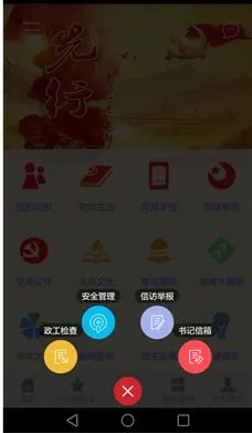 首页下方设置了一个快捷菜单,点击快捷菜单会弹出政工检查、安全管理、信访举报、书记信箱四个常用功能。政工检查用于政工干部录入政工检查信息,安全管理用于各级干部录入安全检查信息,信访举报干部职工可直接通过APP进行信访举报,书记信箱方便党员职工向党委书记反映情况。