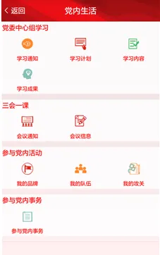 包含“党委中心组学习”、“三会一课”、“参与党内活动”、“参与党内事务”四个板块。