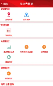 包含“党建地图”、“党建指数”、“为民指数”、“负面信息指数”、“团建指数”五个功能。